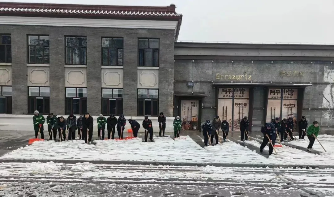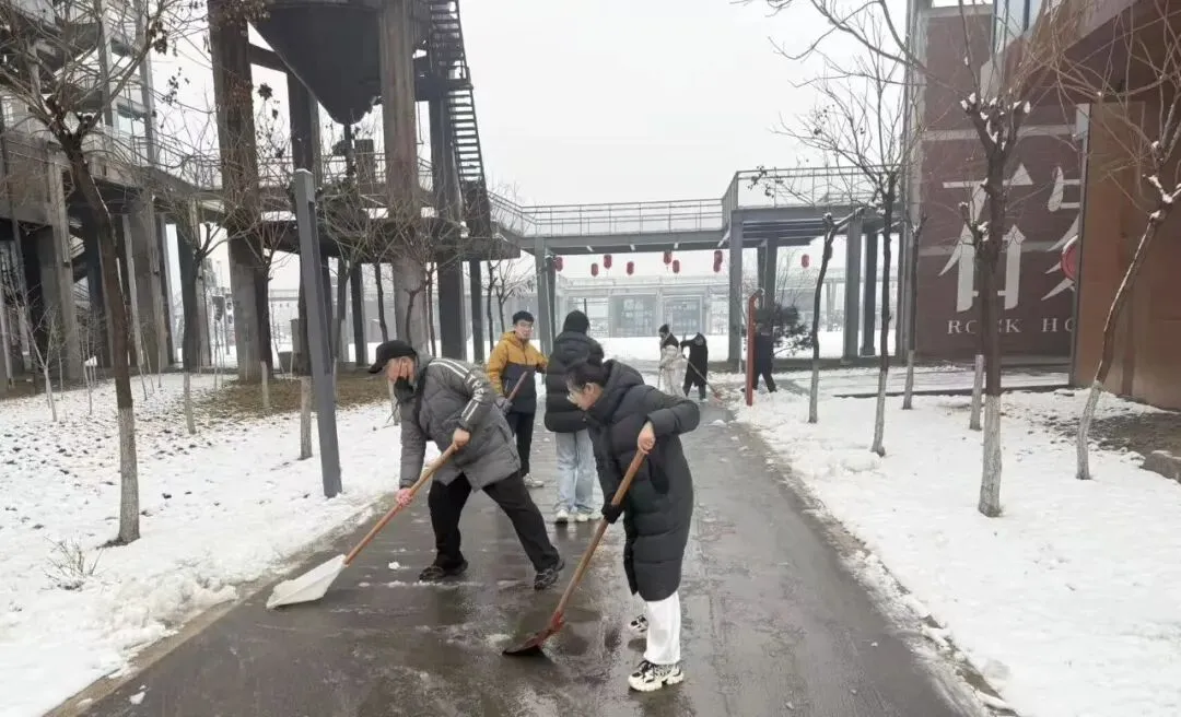 清晨八时许,气温尚在零度以下,文化体育公司各项目现场已是一片忙碌。在石家庄工业遗址公园,由于园区内老旧厂房与步道交错,积雪清理难度较大。品管公司与演艺公司的职工们不畏严寒,迅速集结,他们手持铁锹、推雪板,分工协作,重点对园区主入口、参观通道及活动广场的积雪进行集中清理,确保游客参观路线安全畅通。