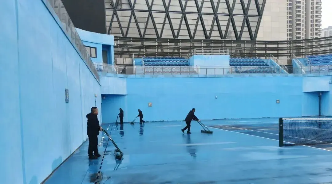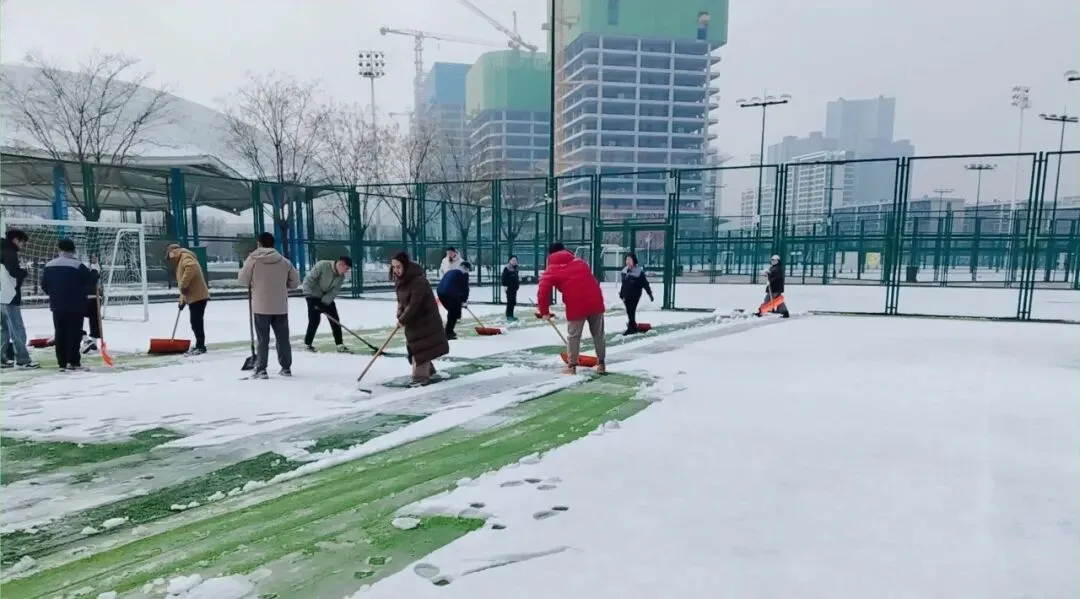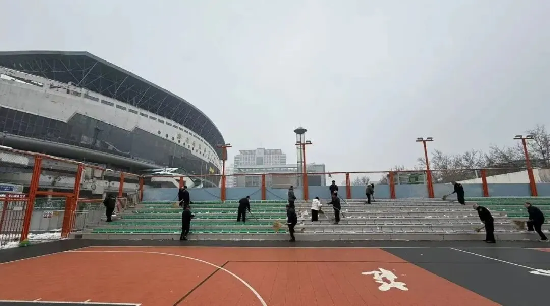 针对体育类公共场所的运动安全需求,各体育场馆板块更是严阵以待。在中央绿色体育公园,勇石公司的除雪队伍重点围绕健身步道、篮球场及儿童活动区域展开作业,为晨练的市民开辟出一片安全的活动区域。与此同时,在裕彤国际体育中心,裕彤公司工作人员正在对体育场外围台阶、停车场及主要出入口进行地毯式清扫,防止夜间降温路面结冰。市网球中心的工作人员也赶在网球爱好者到场之前,将室内外球场及连接通道的积雪全部清理完毕,赢得了球友们的点赞。