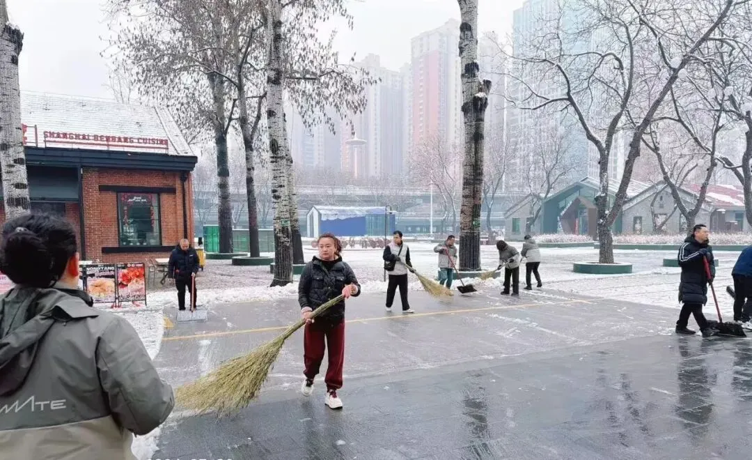 在织音1953文化艺术园区,商管公司与园区分公司联合行动,组成铲冰除雪突击队。他们不仅清理了街区主干道,还对商户门前、楼梯拐角、地下车库坡道等关键点位进行了精细化处理,全力保障园区商户正常经营和市民游客的休闲体验。