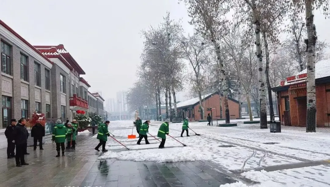 图为石家庄文旅投集团文化体育公司职工在织音1953文化艺术园区开展扫雪除冰工作。