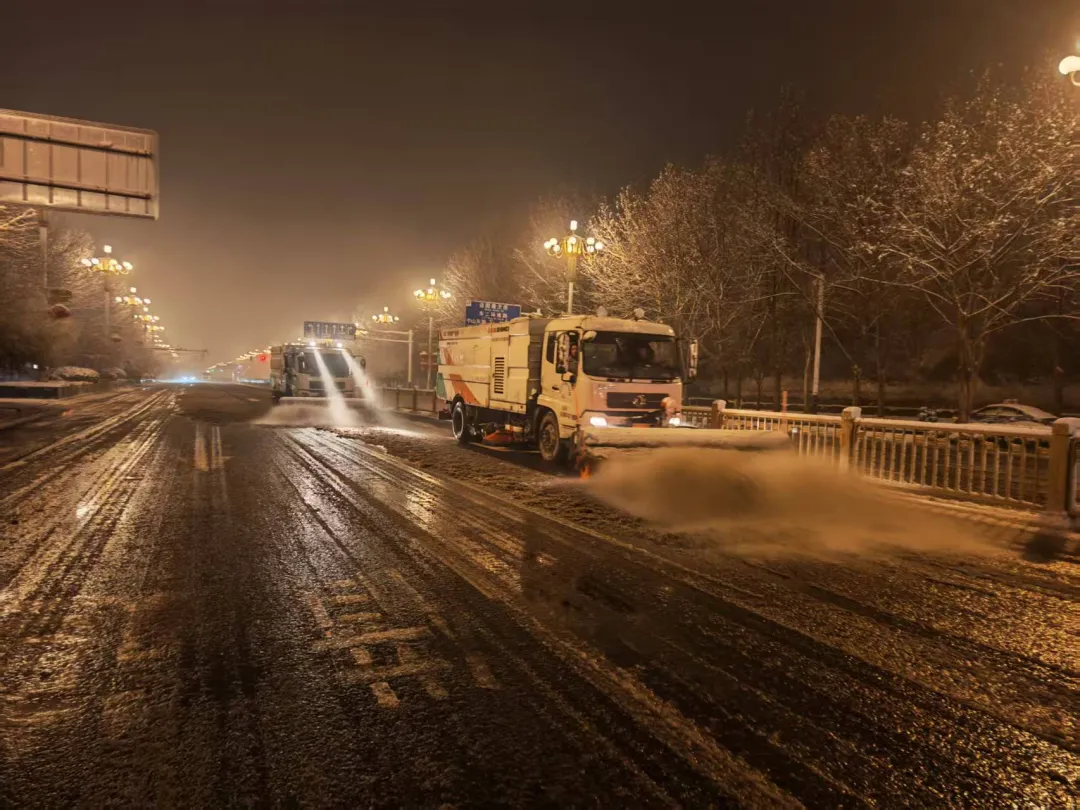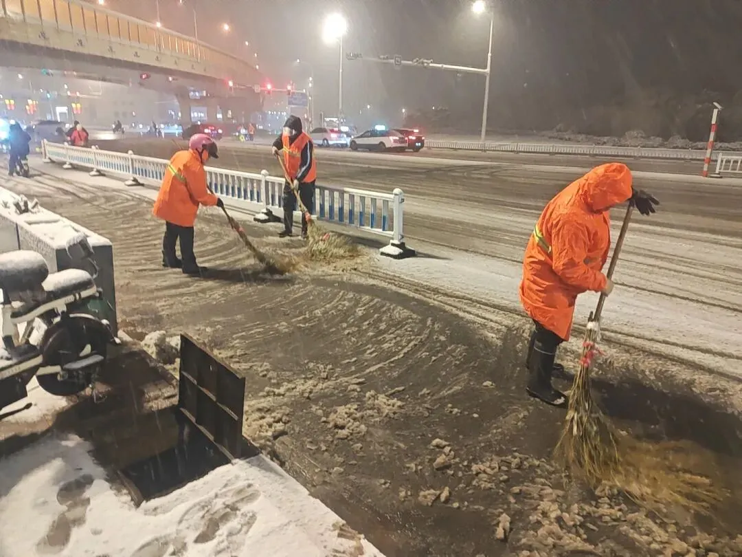 当晚19时30分,市内五区、经开区及二环路环卫力量全员到岗、迅速集结,重点针对人行道、非机动车道、桥梁坡道、路口节点等易结冰、难清理区域,采取人工清扫与机械联合作业模式,高效清除路面积雪,同步清理道路积水与淤泥,最大限度降低道路结冰风险。