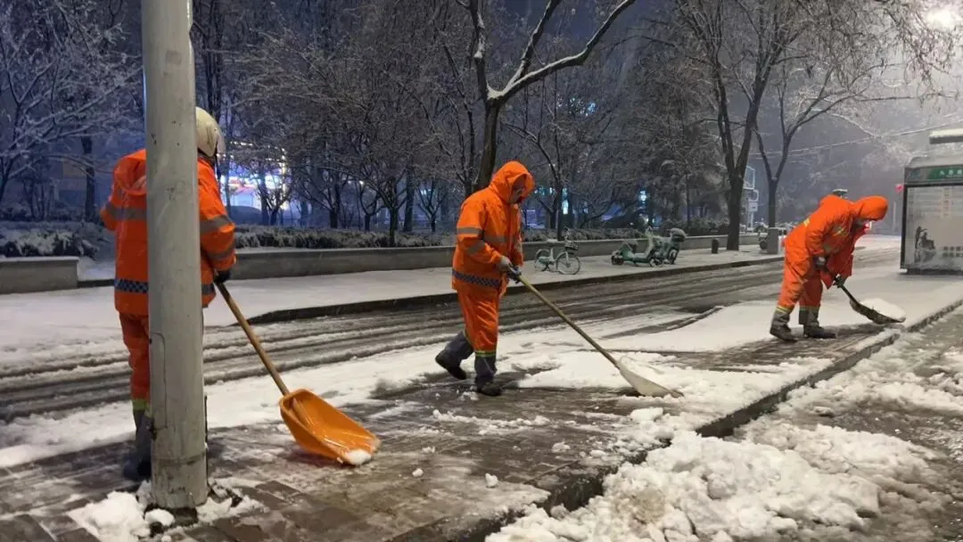 在裕翔街塔北路,雪滚车、雪铲车等大型机械循环往复作业,快速推除主路积雪;在育才街槐安路附近,环卫工人手持铁锹、扫帚、推雪板,对街巷边角、人行便道进行精细化清理……风雪之中,环卫队伍以雪为令、昼夜不息,人机协同、无缝衔接,用彻夜坚守坚守换来道路畅通与市民安全。