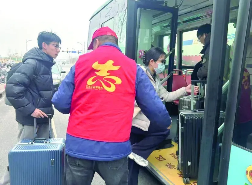 记者看到,在区间车发车点,公交志愿者们忙碌的身影格外醒目。他们主动上前帮学生搬运行李,引导学生有序乘车,还贴心准备了应急药品等物资,为有需要的学生提供帮助。“同学,我来帮你拎这个大箱子!”志愿者苗师傅一边接过学生手中的行李箱,一边叮嘱学生注意乘车安全。