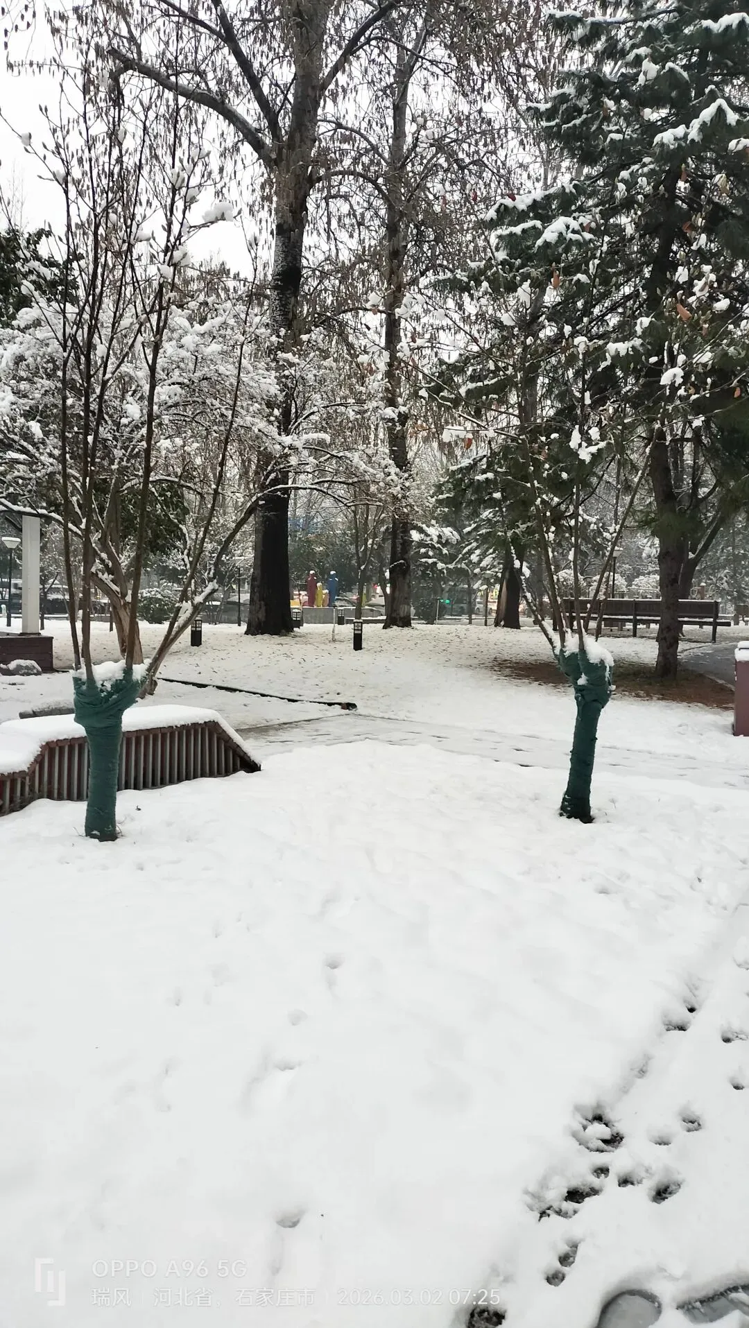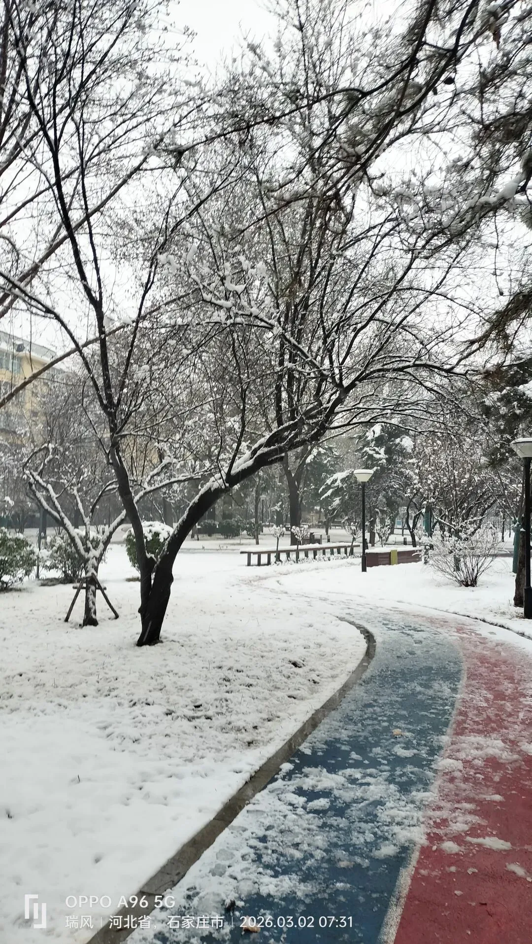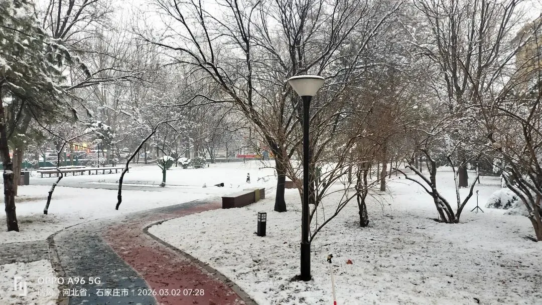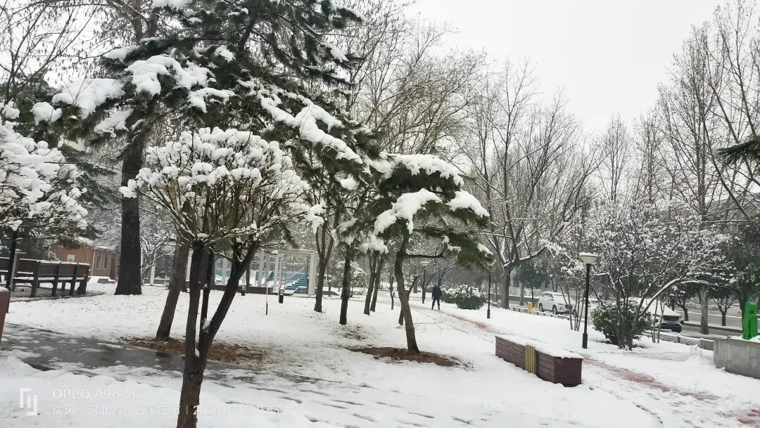 跑道上,积雪压弯了枝桠,