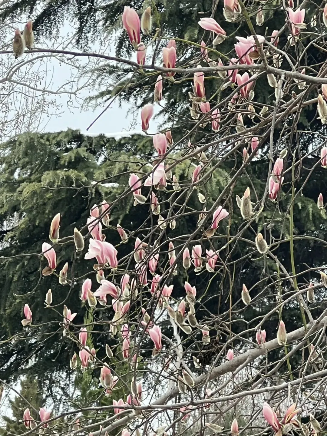 长安公园,一眼就看到了春景园里的二乔玉兰——花苞鼓鼓的,几朵抢先破壳,粉紫镶白边,在蓝天底下特别亮眼。