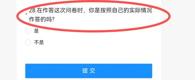 并且,每套问卷的开头都是“我承诺所有回答均基于真实情况,不存大虚假或夸大其词的情况”,结尾都是“是按照自己的实际情况作答的吗?”,双重心理暗示+态度确认,能看出在引导大家如实填答,想让大家如实作答!