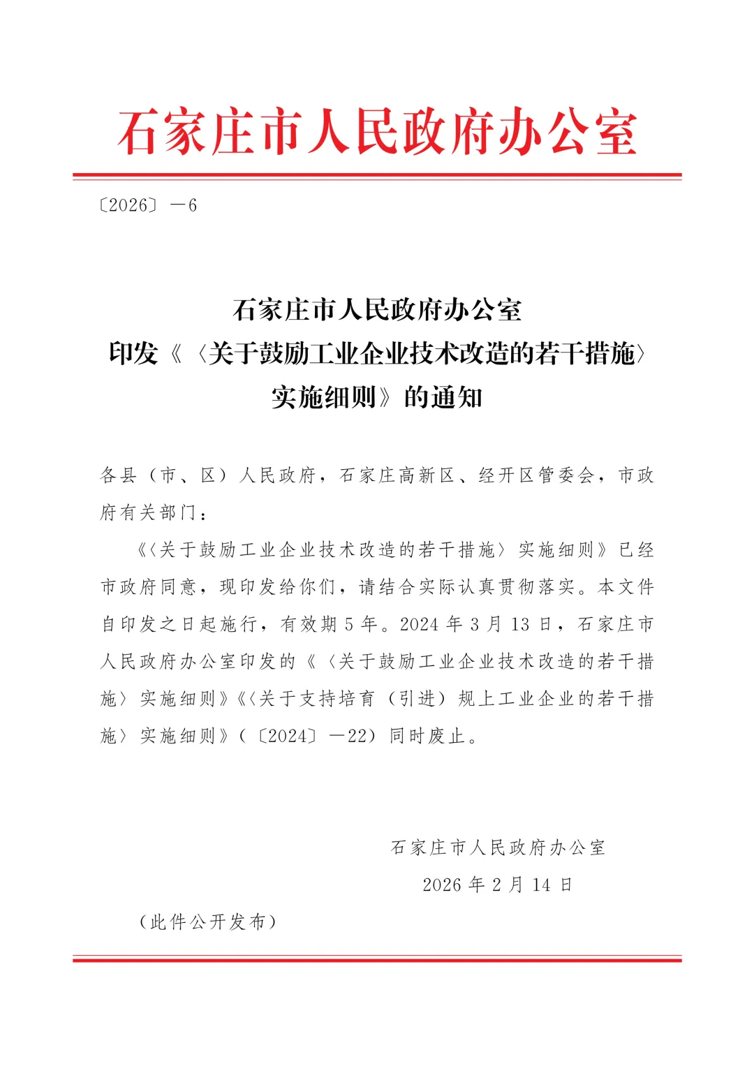 >石家庄市人民政府办公室印发 《 <关于鼓励工业企业技术改造的若干措施>实施细则》 的通知