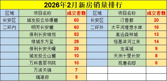 先讲长安区,因2月份过年,成交上20套的项目较少,我把销量突出的项目讲讲,主要讲缺点,首先,城发投云华璟樾,就是7420,北边临铁路,毛坯交付,物业费1.95元,服务标准要比物业费近3块的新楼盘少一些。但是随着最后一栋110平的加推,东侧紧挨着70亩的璟樾公园,价格较之前贵了不少总价来到了165-175万,又被长安樾涨价带了一波流量,保利长安琅悦的成交也比较亮眼,放假期间更是扛了整个长安区的量。最关键是这两个项目也没有什么额外的优惠。国央企在去年下半年把23中本部片区的热度带起来了。很多粉丝想在2026年上初中的都会去选择看看翡翠家园二手次新房。 继续是石钢片区,最近凯琦玖瑞府的热度很高,但同时价格也不断被购房者提及,笔者认为,成交价格区间是1.5-1.7万,和东方玺一样,但是交房肯定是比东方玺要晚的,同样是毛坯,我岂不是住进去都要等到一些新规项目都交房以后?也正因如此,一些不想再等的客户选择了27年交房的新规产品。比如保利长安琅悦,保利裕华天珺。东方玺也在伺机而动,它在等凯琦开盘后,宣布开放下沉式实景会所,借机收割一波觉得凯琦交房晚的客户。但是缺点也是客观存在的,东方玺层高3米,一梯两户,凯琦是层高3.15米,比东方玺高出半头,两梯两户,全屋四玻。 想具体了解凯琦的缺点的朋友,可以看我的这一期视频。一旦有摇滚音乐节,家里秒变演唱会现场,3D立体声环绕,好不刺激。 华药板块,天曜不用多说,预算够得上280-300万,值得一看的项目,缺点就是贵,但是户型格局没毛坯。你看现在新入市的凯琦和天正项目,户型图一出,一堆人疯狂diss就知道保利的户型优势了。嫌凯琦128平虽然卧室通透,客厅那面墙是大了,但是主卧有2平米的过道,浪费面积;天正128平和186平居然没做出来餐厅,难道真要在茶几上吃饭?新规户型究竟是进步还是退步?! 天珺的产品不用多说,吐槽最多大的就是2.59容积率,一共1070户。住的人多,但是装修标准要好一些,同时也有下沉会所。游泳池外包出去了。