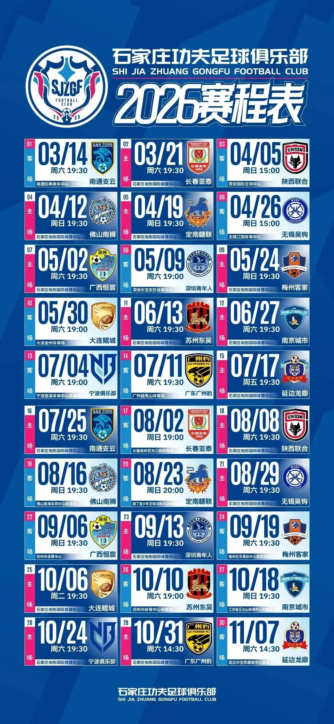 春节假期过后,中国足球甲级联赛官方公布了2026赛季的完整赛程。新赛季中甲联赛将于3月14日开幕,11月7日结束。石家庄功夫足球队新赛季开局就面临考验,前两场比赛分别对阵过去两个赛季的中超降级球队南通支云和长春亚泰。