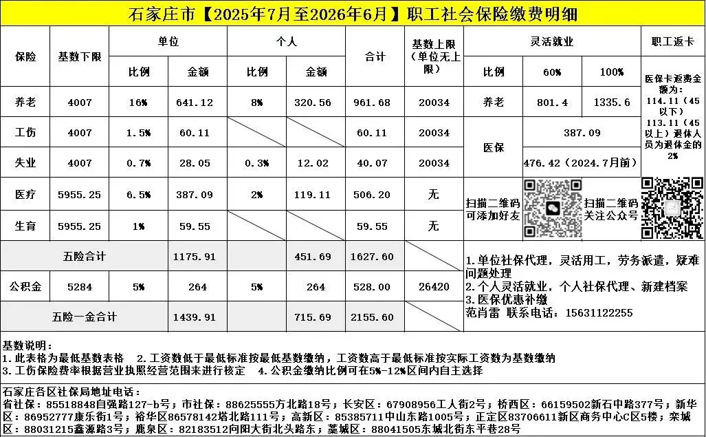 2026年现行石家庄市五险一金最新最低基数表