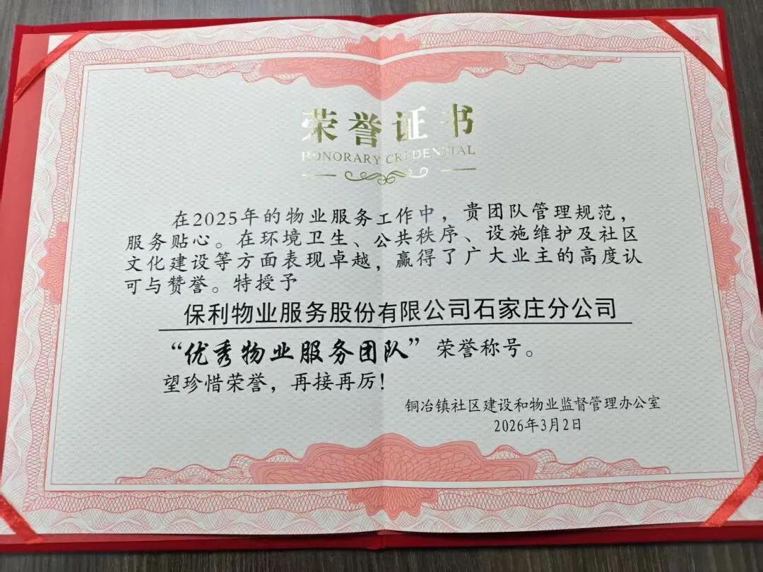 近日,保利物业服务股份有限公司石家庄分公司凭借规范的管理、贴心的服务,在环境卫生、公共秩序、设施维护及社区文化建设等方面的卓越表现,被铜冶镇社区建设和物业监督管理办公室授予“优秀物业服务团队”荣誉称号。