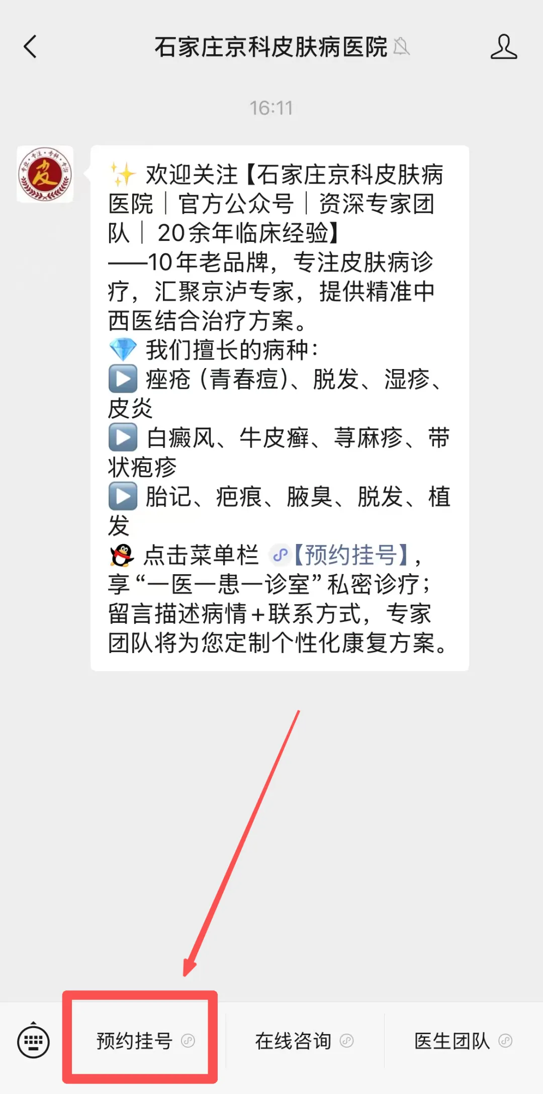 微信搜索【石家庄京科中医皮肤病医院】,关注官方服务号或公众号。