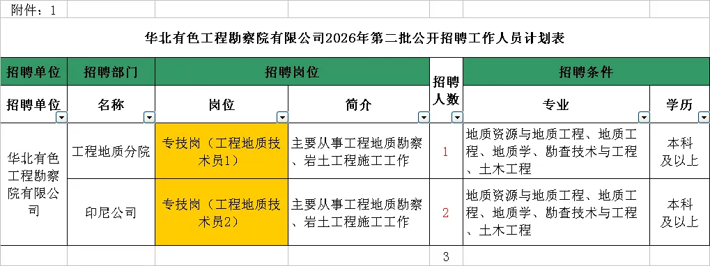 根据《天津华勘集团有限公司企业编制人员招聘管理办法》(津华勘集团人(2025)30号)规定,华北有色工程勘察院有限公司2026年第二批面向社会公开招聘企业编制人员3名,具体方案公告如下。一、招聘单位名称华北有色工程勘察院有限公司二、招聘对象及招聘条件(一)招聘对象符合岗位要求及报考条件的社会人员。