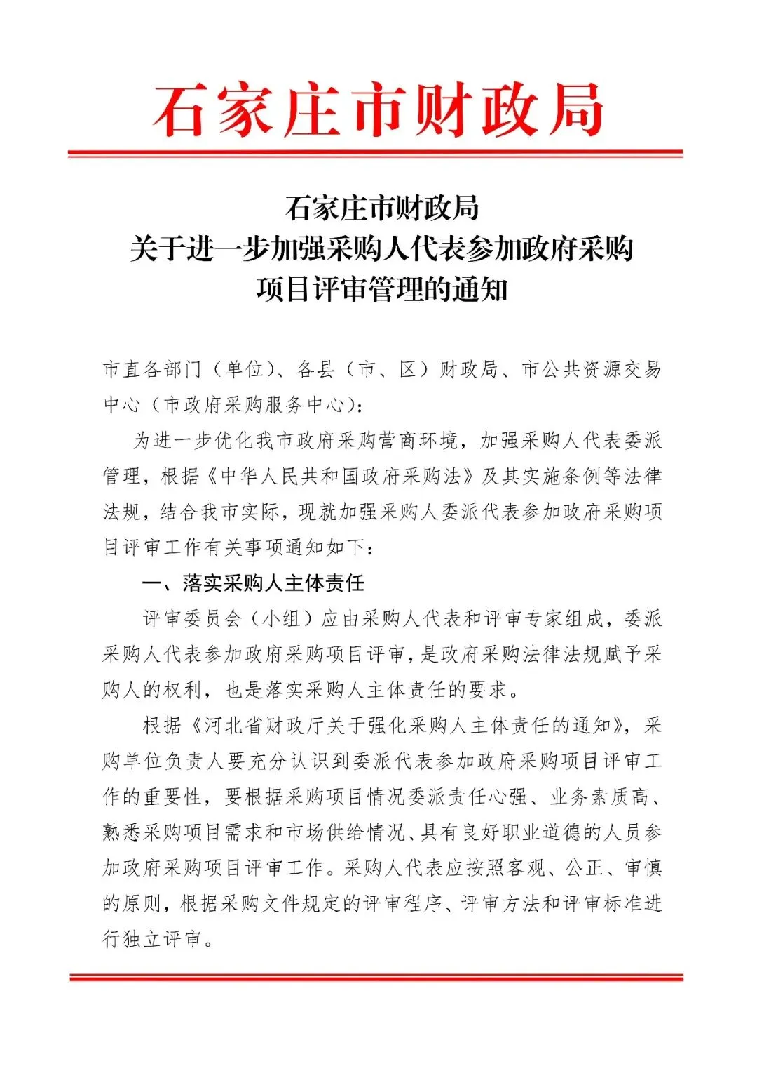 石家庄市财政局关于进一步加强采购人代表参加政府采购项目评审管理的通知