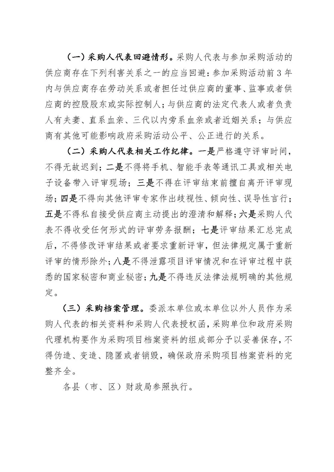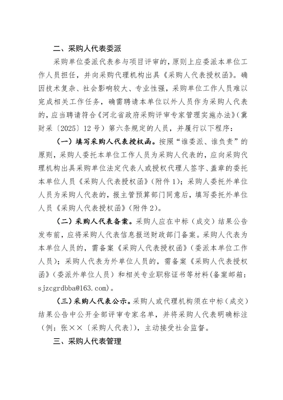 采购单位委派代表参与项目评审的,原则上应委派本单位工作人员担任,并向采购代理机构出具《采购人代表授权函》。确因技术复杂、社会影响较大、专业性强,采购单位工作人员难以完成相关工作任务,确需聘请本单位以外人员作为采购人代表的,应当聘请符合《河北省政府采购评审专家管理实施办法》(冀财采〔2025〕12号)第六条规定的人员, (一)具有良好的职业道德,廉洁自律,遵纪守法,无行贿、 受贿、欺诈等不良信用记录: (二)具有中级专业技术职称或同等专业水平且从事相关领域工作满8年,或者具有高级专业技术职称或同等专业水平; (四)承诺以独立身份参加评审工作,依法履行评审专家工作职责并承担相应法律责任的中国公民; (六)申请成为评审专家前三年内,无本办法第三十四条规定的不良行为记录。 对评审专家数量较少的专业,前款第(二)项、第(五)项所列条件可以适当放宽。 按照“谁委派、谁负责”的原则,采购人委托本单位工作人员为采购人代表的,应向采购代理机构出具采购单位法定代表人或授权代理人签字、盖章的委托本单位人员《采购人代表授权函》(附件1);采购人委托外单位人员为采购人代表的,报主管预算部门同意后,填写委托外单位人员《采购人代表授权函》(附件2)。 采购人应在中标(成交)结果公告发布前,应将采购人代表信息报送财政部门备案。采购人代表为本单位人员的,需备案《采购人代表授权函》(委派本单位工作人员);采购人代表为外单位人员的,需备案《采购人代表授权函》(委派外单位人员)和相关专业职称证书等材料(备案邮箱:sjzcgrdbba@163.com)。 采购人或代理机构须在中标(成交)结果公告中公开全部评审专家名单,并将采购人代表明确标注(例:张××〔采购人代表〕),主动接受社会监督。 采购人代表与参加采购活动的供应商存在下列利害关系之一的应当回避:参加采购活动前3年内与供应商存在劳动关系或者担任过供应商的董事、监事或者供应商的控股股东或实际控制人;与供应商的法定代表人或者负责人有夫妻、直系血亲、三代以内旁系血亲或者近姻关系;与供应商有其他可能影响政府采购活动公平、公正进行的关系。 一是严格遵守评审时间,不得无故迟到;二是不得将手机、智能手表等通讯工具或相关电子设备带入评审现场;三是不得在评审结束前擅自离开评审现场;四是不得向其他评审专家作出歧视性、倾向性、误导性言行;五是不得私自接受供应商主动提出的澄清和解释;六是采购人代表不得收受任何形式的评审劳务报酬;七是评审结果汇总完成后,不得修改评审结果或者要求重新评审,但法律规定属于重新评审的情形除外;八是不得泄露项目评审情况和在评审过程中获悉的国家秘密和商业秘密;九是不得违反法律法规明确的其他规定。 委派本单位或本单位以外人员作为采购人代表的相关资料和采购人代表授权函,采购单位和政府采购代理机构要作为采购项目档案资料的组成部分予以妥善保存,不得伪造、变造、隐匿或者销毁,确保政府采购项目档案资料的完整齐全。