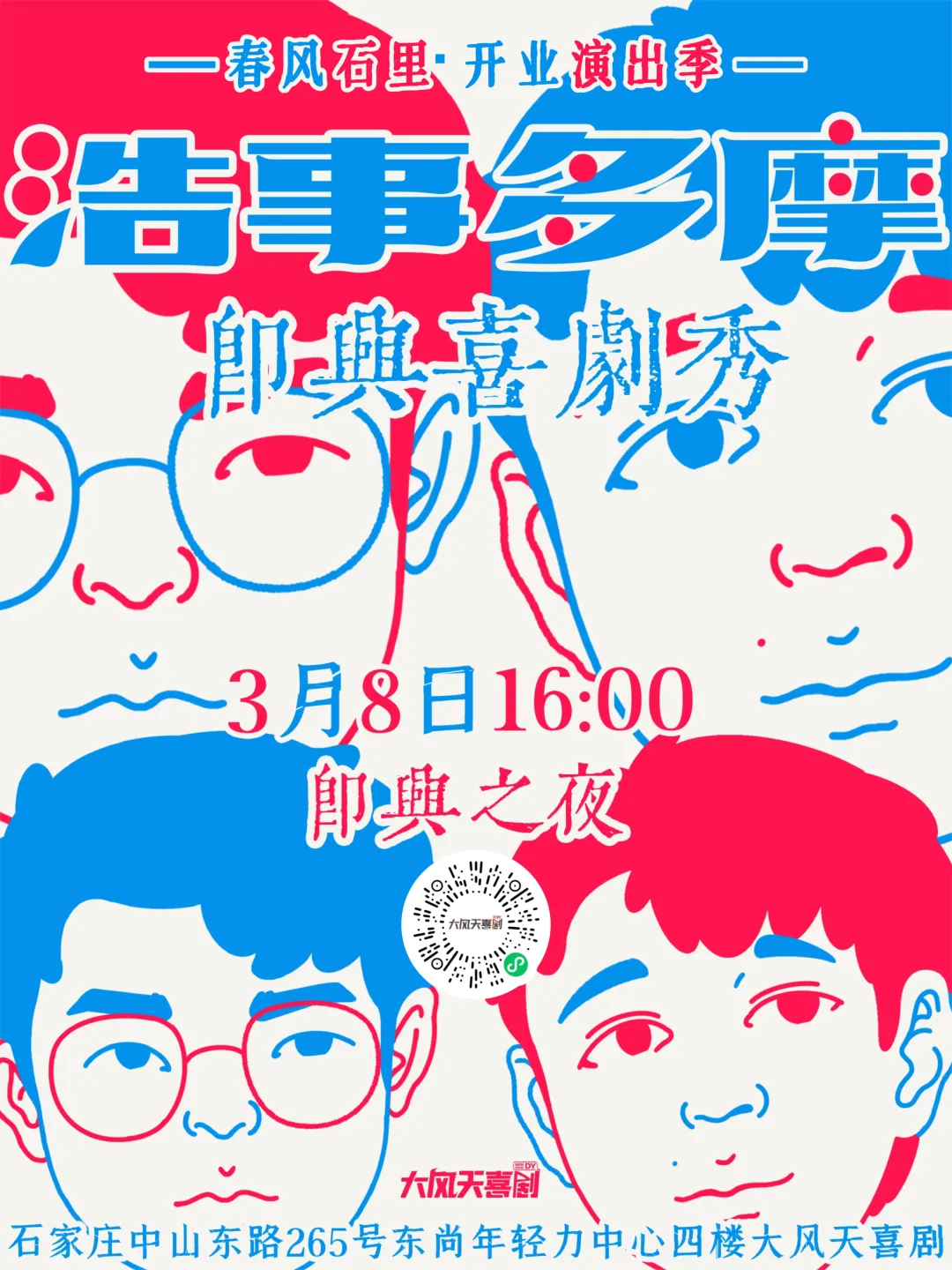 ,石家庄当然也不例外!二维马单口喜剧入门课,赵梓辰即兴喜剧课也在筹备当中啦!将很快与石家庄的喜剧爱好者们见面!感兴趣的朋友,可以添加石家庄大风天喜剧客服微信,了解一手动态!(想参与石家庄大风天喜剧每周四晚开放麦的演员朋友们,也可以加下方微信报名哦)这是大风天重要的一步,希望石家庄的朋友们能接纳我们、喜欢我们。愿意在下班后、闲暇时走出家门,来一碗板面,吹一吹喜剧的风。本文评论区留下“你想对石家庄大风天喜剧说的话”,我们将随机抽取5名幸运的朋友,每人送出3月8日浩事多摩即兴喜剧-开业秀门票2张!