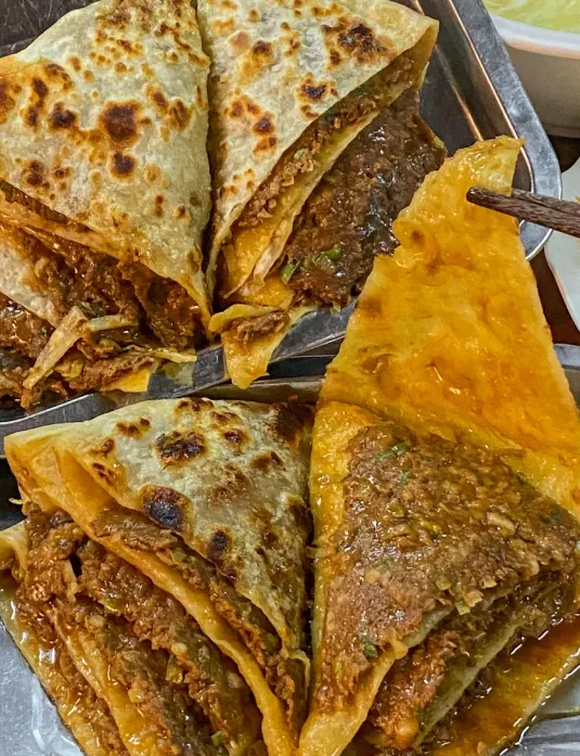 重点推荐香河肉饼。不是那种厚面皮的馅饼,而是油酥千层。师傅手快,面皮擀得薄如纸,肉馅铺得满当当。烙熟后切成菱形块,外皮一碰就酥得掉渣,咬开后,肉汁混合着葱香“滋”地一下溢满口腔,油润却不腻,两块下肚,胃里暖洋洋的,舒服。