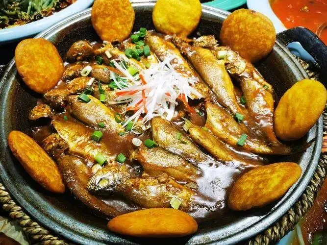 这菜讲究个“乱炖”。几条刚出水的杂鱼,不用太名贵,鲤鱼、嘎鱼一锅烩。大铁锅底下烧着柴火,锅边贴上一圈玉米面饼子。酱汤咕嘟咕嘟冒泡,鱼肉吸饱了汤汁,饼子下半截焦脆,上半截松软,蘸着鱼汤吃,那是真香。