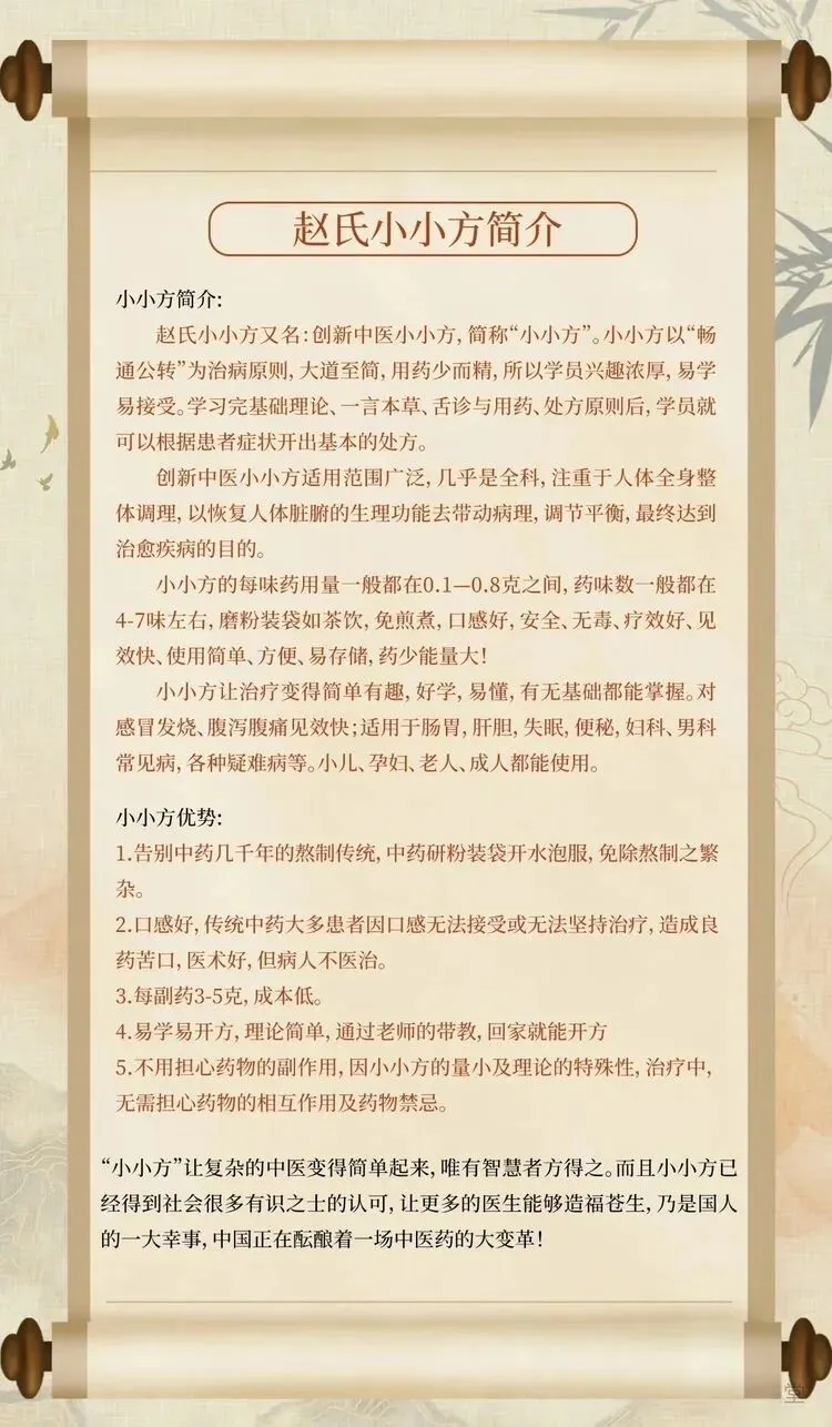 中药小小方是根据症状结合舌诊快速制定精准方案,治疗范围广,几乎全科,注重于人体全身整体调理,以恢复人体脏腑的生理功能,去带动病理调节平衡,最终达到治愈疾病的目的,适用于常见病及各种疑难病,所涉及到的中药极少(常用的30多味,经常使用的10几味),即使没有中医用药基础的朋友也可以很快入门,用药量少,初学者可以快速体验效果,易学,易懂,易用、操作简单方便、病人易接受等优势。