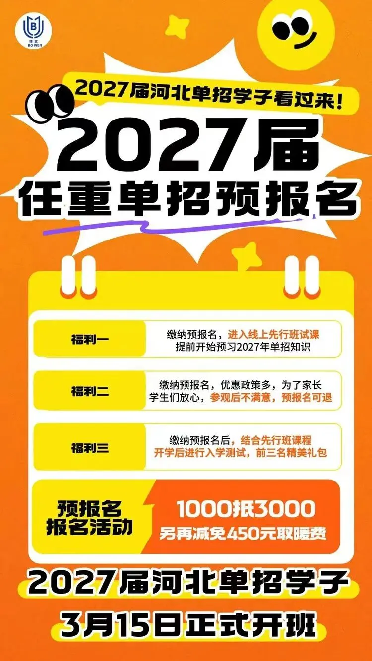 2027年河北单招考试备考已进入关键阶段,石家庄任重博文单招培训正式开启预报名!2027届单招培训班将于3月18日正式开班,现在预报名可享1000元抵3000元学费优惠,同时减免取暖费,优惠活动截止至3月15日,有意向的考生及家长请抓紧时间咨询。