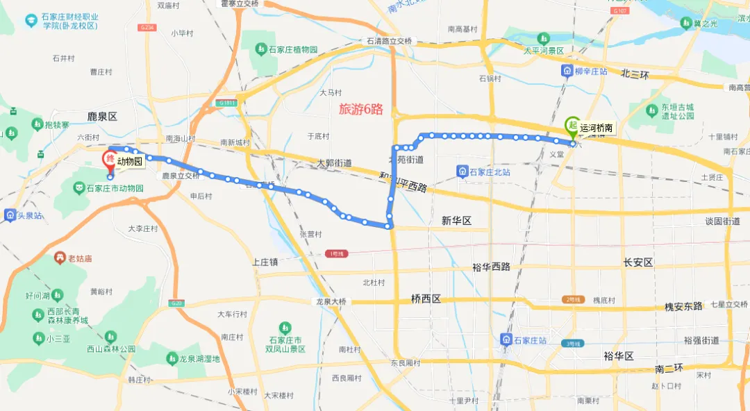 旅游6路是从动物园到运河桥的公交,基本就是从鹿泉城区,沿着新华路,到西二环,再到联盟路,到达运河桥。