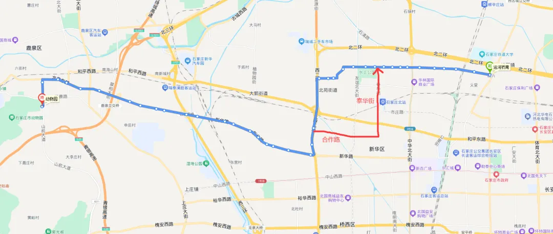 2、从西二环转合作路东行,到泰华街,北行到石家庄北站,然后继续北行到联盟路,恢复原线路,到运河桥。
