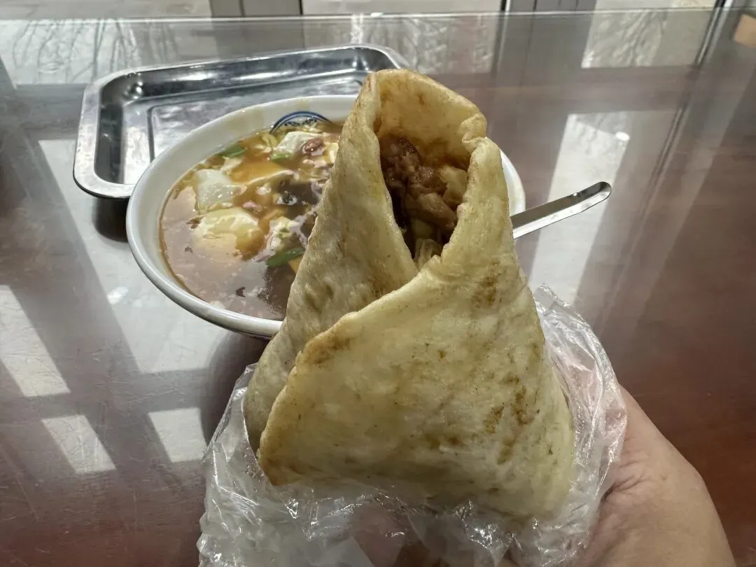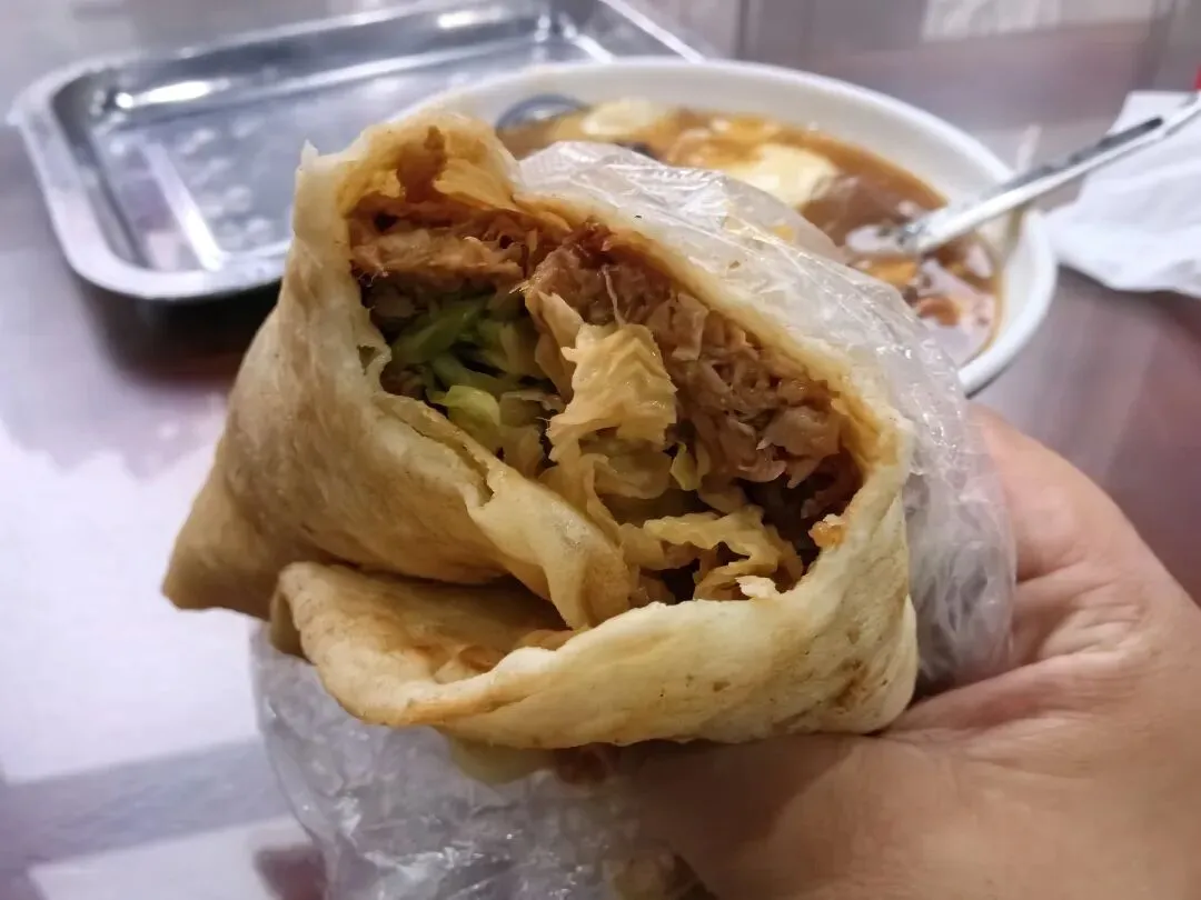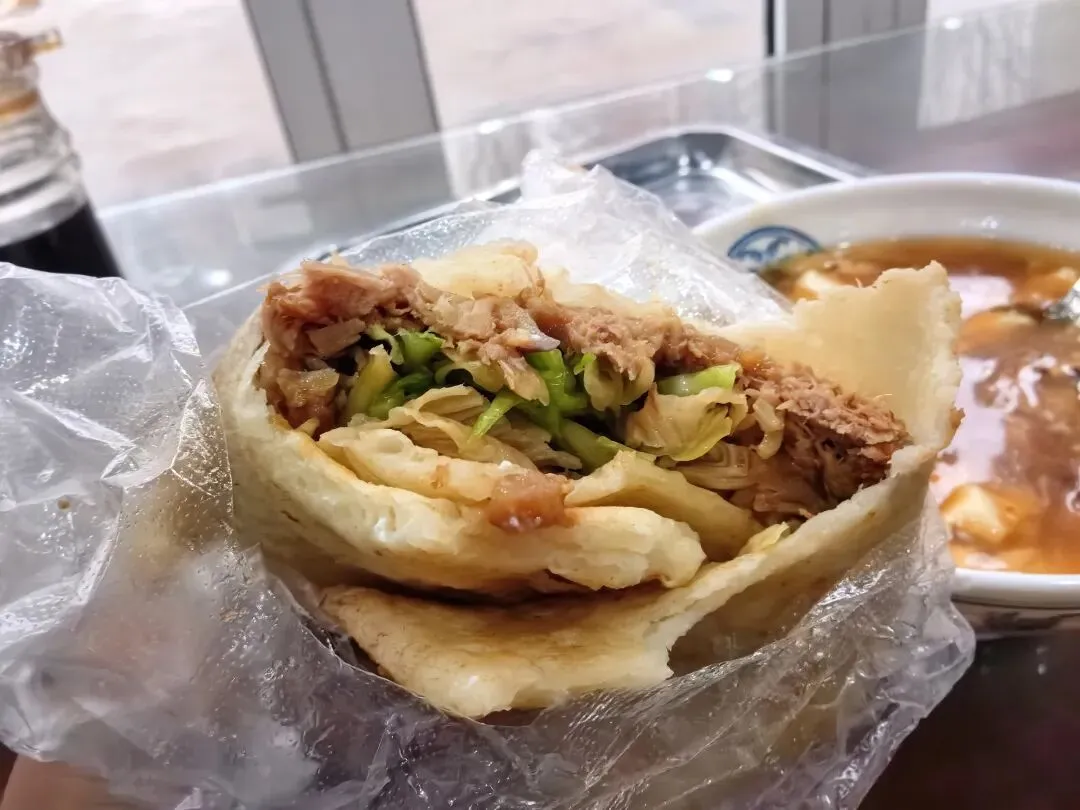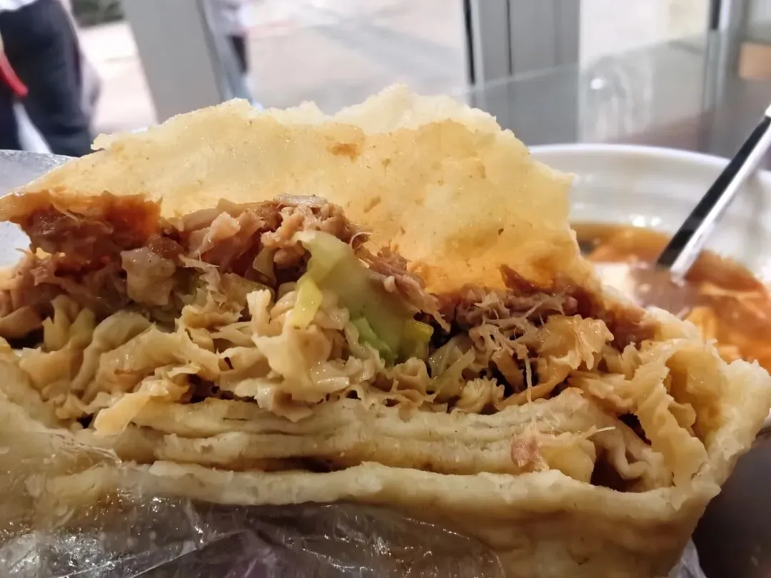 他家的饼卷肉有点让人看不懂了,本来以为会是老家的那种摊上一块块的牛肉粒,结果是碎肉,好像还是猪肉的,然后再加菜就不稀奇了,因为这和老家的肉夹馍几乎一模一样,只是换了个饼皮而已。第一次吃最像肉夹馍的饼卷肉,虽然没有给我太大的惊喜,但也感受到了不同区域的美食差异。