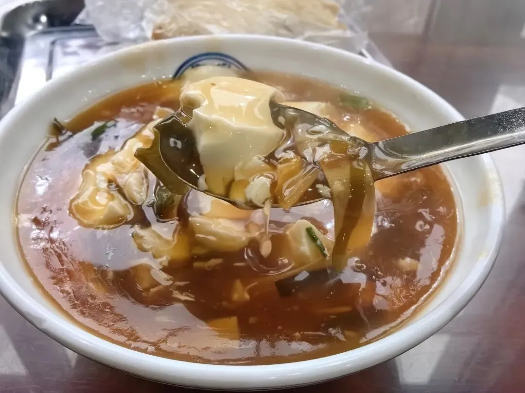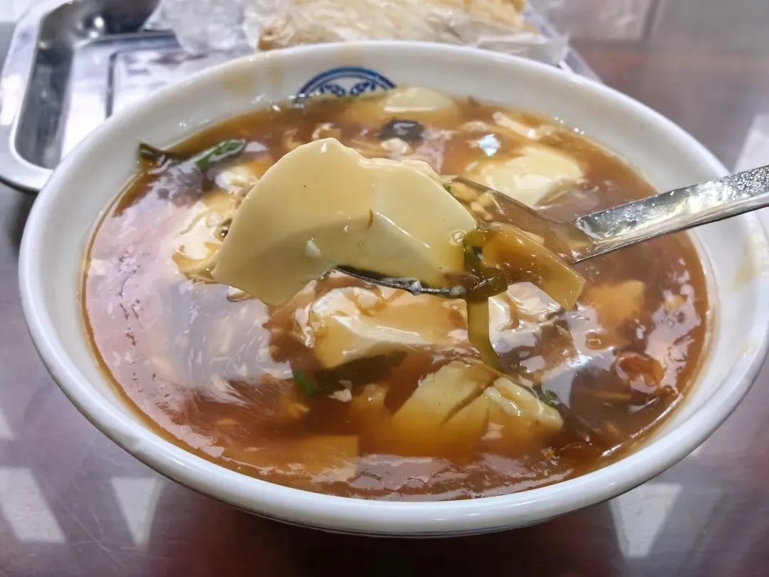 他家的豆腐脑还是挺不错的,里面还有豆皮、海带等,吃起来滑滑嫩嫩的,味道还不错。