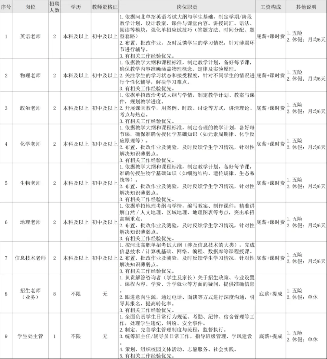 七、招聘程序(一)发布公告2026年2月28日通过诺优考https://w.nuoyoukao.com向社会公开发布招聘信息。(二)报名和资格审查1.报名方式及时间采用网上报名和资格初审的方式,每名报考人员只能报考一个岗位。报名网址:https://s.nuoyoukao.com/s/2623网上报名时间:2026年2月28日—2026年3月20日下午16:00报名咨询电话:0311-85256519(工作时间:周一至周五上午9:00-12:00,下午13:00-17:00)2.报名注意事项每人限报一个岗位。资格审查标准:依据招聘岗位设置的条件进行资格审查。网上资格初审通过的考生可进入网上缴费环节。系统显示缴费成功后即报名通过,具备参加笔试资格(报考招生老师岗位,且符合岗位要求的考生无需缴费及参加笔试,面试时间另行通知,请报考该岗位的考生保持手机畅通)。查询结果为“初审驳回”的考生可根据提示驳回原因进行修改,审核工作人员根据修改后信息进行再次审核。经修改后,初审结果仍显示“未通过”且不能再修改的考生不具备报名资格。网上资格初审通过的考生可进入网上缴费环节,缴纳考试服务费100元(招生老师岗位除外)。系统显示缴费成功后即报名通过,具备参加笔试资格,缴费成功后不予退费,请考生慎重考虑。网上审核时间:2026年2月28日—2026年3月20日下午17:00网上缴费截止时间:2026年3月21日12:00特别说明:1.考生开始报名前,须详细了解本次招聘政策和拟应聘岗位条件,认真阅读《报考须知》,然后按步骤进行具体操作。2.网上报名实行严格的自律机制,考生必须对提交审核的报名信息的真实性负责。在资格审核时,凡发现网上填报的信息与实际情况不一致的,取消应聘资格。3.报名时请规范填写和选择表项,上传的电子照片要符合要求,否则将被报名系统自动拒绝。报考信息通过审核后才能进行缴费操作,缴费成功即完成报名。4.考生应及时关注报名网站的笔、面试等后续公告;务必牢记报名和缴费截止时间、打印《笔试准考证》时间、笔试时间、打印《面试通知单》时间、面试时间等重要时间信息,凡是在规定时间未完成相关操作的,将被视为自动放弃。同时,报名和考试期间务必保管好个人的证件和信息,因个人原因造成丢失、被他人盗用和信息被恶意篡改而影响报名和考试的,责任自负。(三)笔试(招生老师岗位除外)1.笔试内容:笔试采取闭卷方式进行,考试时间90分钟。包含教育学、教育心理学、教学教法、教育法律法规、教师职业道德、时政、专业知识等(不指定复习材料),满分100分,笔试成绩占总成绩的30%。2.笔试具体地点及考试时间和要求详见《笔试准考证》。应聘人员应按照准考证上确定的考试时间、地点、考场参加考试。参加考试时,必须同时携带准考证和有效期内二代身份证(含有效期内的临时身份证),缺少证件的考生不得参加考试。 (四)面试(招生老师岗位除外)面试方式及时间详见后续通知。面试成绩满分为100分,占总成绩的70%,并设合格分数线60分,面试成绩低于60分的不得进入下一招聘环节。 (五)签订合同上岗1.经公示期满无异议的拟录用人员,或有反映问题但经核实不影响录用的,按规定签订劳动合同。2.对公示反映有严重问题并查有实据,不符合录用条件的,取消其拟录人选资格,对反映有严重问题但一时难以查实的,暂缓录用,待查实并做出结论后决定是否录用。3.在办理录用手续期间,不在规定时间报到的,取消其录用资格,并从报考同一岗位中,按总成绩从高分到低分依次递补。4.被录用人员与学校所属单位直接签订《劳动合同》,办理入职、工资、社会保险等相关事宜。(六)福利待遇考核通过后,缴纳社会保险(五险)、提供带薪年假、节日福利、免费住宿、学校食堂、专业培训与晋升机会等。(七)其他有关事项1.凡考生未在规定时间内按要求参加笔试、面试、报到等环节的,均视为自动放弃应聘资格;资格审核贯穿招聘工作全程,在任何环节,发现考生不符合招聘条件,弄虚作假的,取消应聘资格,问题严重的要追究责任。2.请考生网上报名时,务必填写本人常用联系方式,确保在招录期间保持手机等通讯设备畅通。3.考生通过最终面试后与学校有7天的互相考察期。
