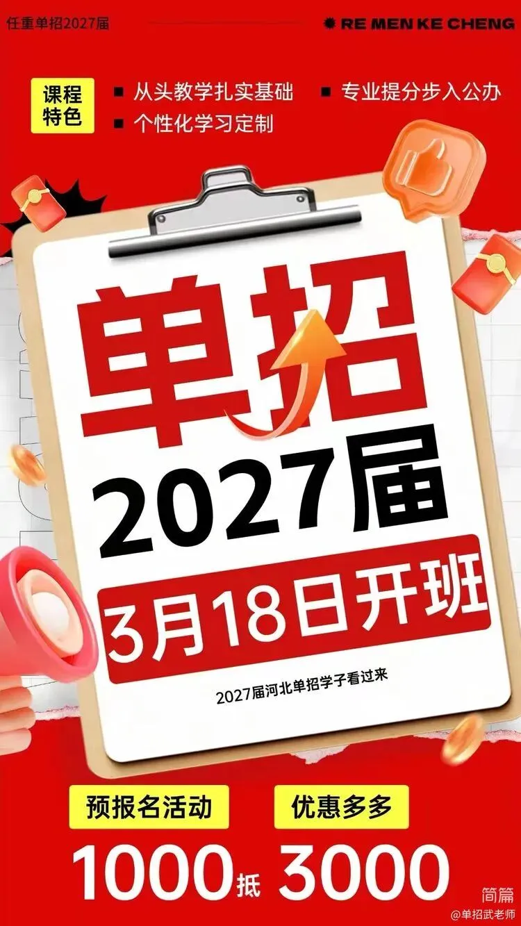 2027届河北单招学子注意啦!石家庄任重博文单招培训班预报名正式开启,2026年3月18日准时开班,现在报名即可享受1000抵3000学费优惠,还能减免取暖费,优惠活动3月15日截止,名额有限,先到先得!