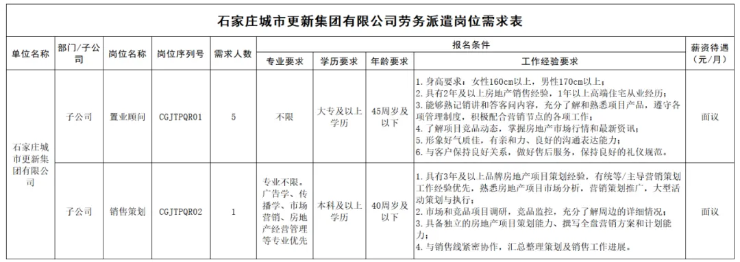 据工作需要,石家庄城市更新集团有限公司特委托石家庄市国经人力资源管理有限公司面向社会公开招聘劳务派遣制人员6名。现将具体招聘事宜公告如下: