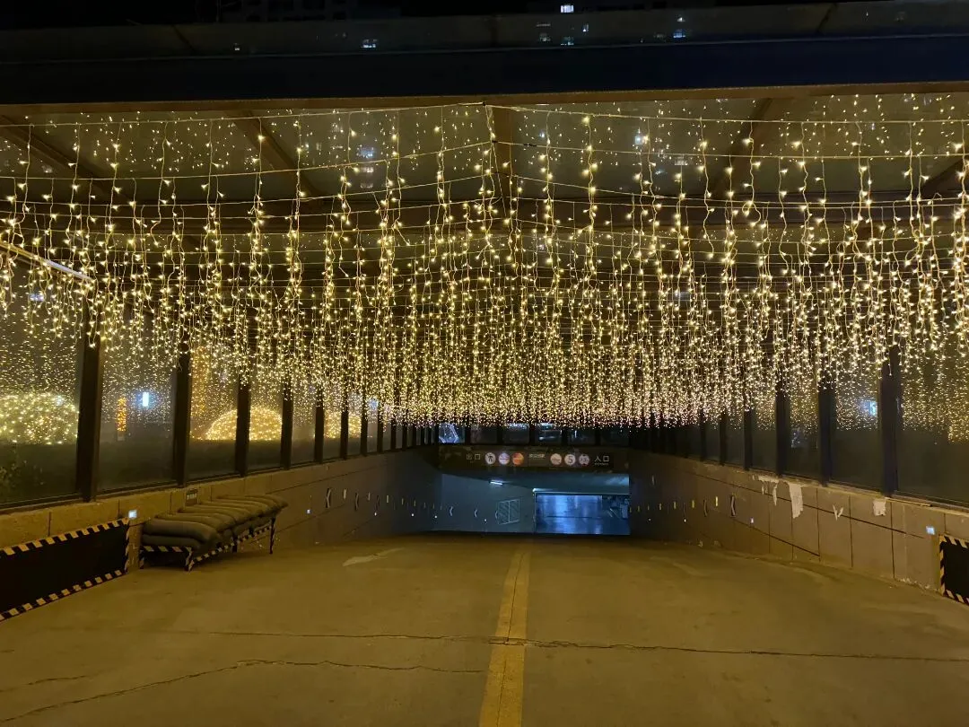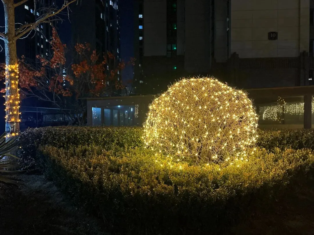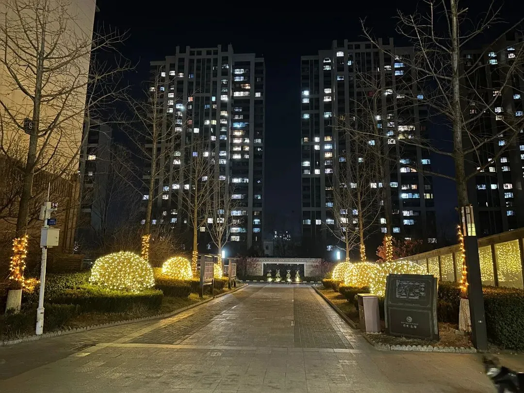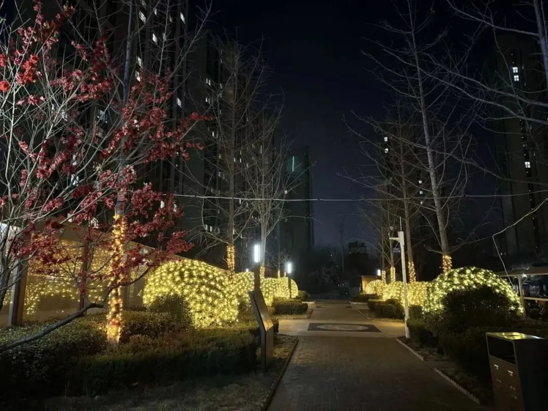 夜色渐浓,灯火璀璨。一盏盏暖光如星河坠落,照亮归家之路。枝头缀满喜庆的花艺,为冬日的园区添上一抹鲜亮,喜庆的氛围萦绕其间,满目皆是新年的美好与祥和。