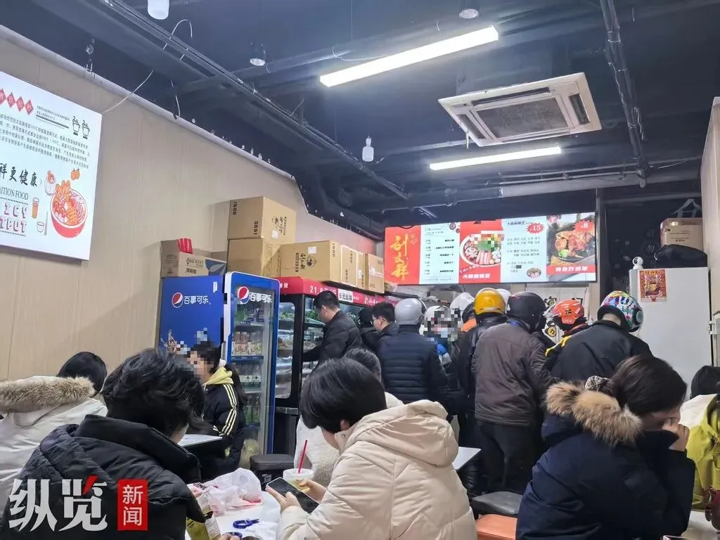 3月3日12时,刘文祥麻辣烫(长安万达店)店内多位外卖员正等待取餐。(王怡文/摄)