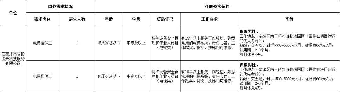 石家庄市交投国兴科技服务有限公司是石家庄市交投实业集团有限公司的全资子公司,隶属于交投集团,涵盖科技中介、酒店管理、餐饮管理特种设备安装改造修理、等各项专业服务。石家庄市永通企业管理咨询有限公司是石家庄市交投国兴科技服务有限公司人力服务外包业务承接单位,现面向社会公开招聘外包人员,具体招聘事宜公告如下:一、招聘原则与招聘方式(一)招聘原则招聘工作坚持德才兼备的用人标准和“公开、平等、竞争、择优”的原则,面向社会实行市场化公开招聘。(二)招聘方式采取网上报名、资格初审、面试、体检、拟录用等步骤进行。二、招聘岗位及薪资福利待遇(一)招聘岗位及要求