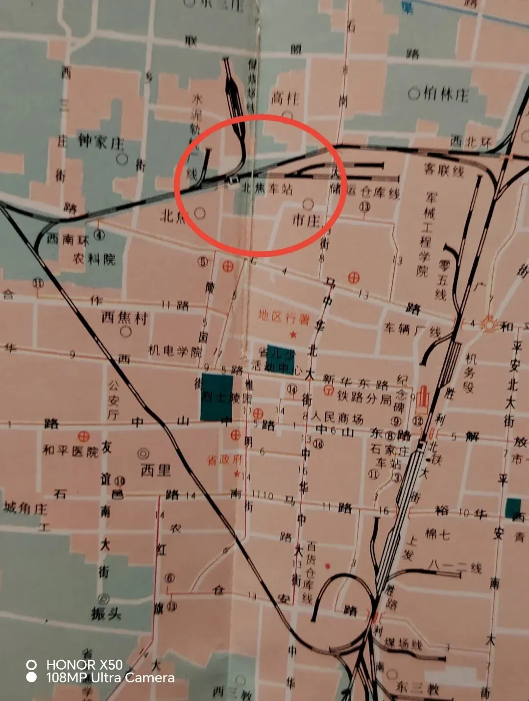 ▼1988年《石家庄铁路枢纽、公交图》显示的北焦车站位置