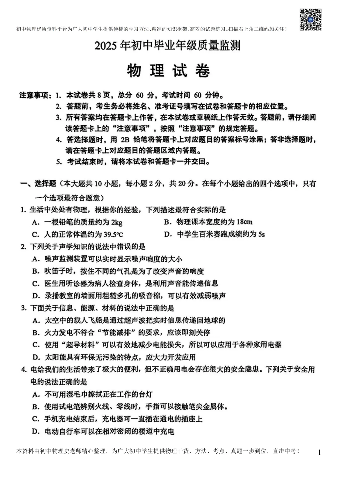 【中考物理模拟卷】2025年3月石家庄桥西区区模卷(含答案)