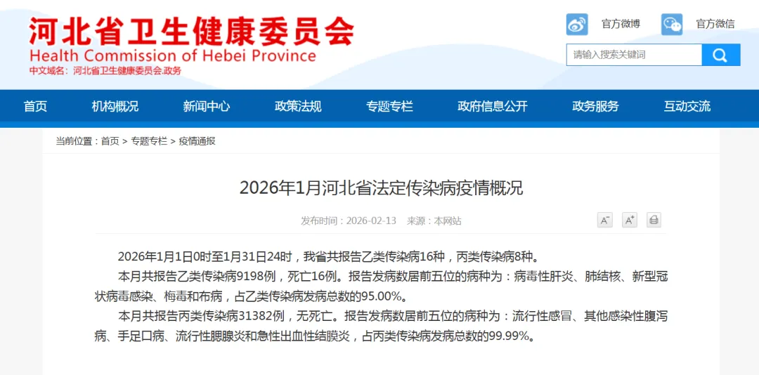 2026年1月1日0时至1月31日24时,我省共报告乙类传染病16种,丙类传染病8种。