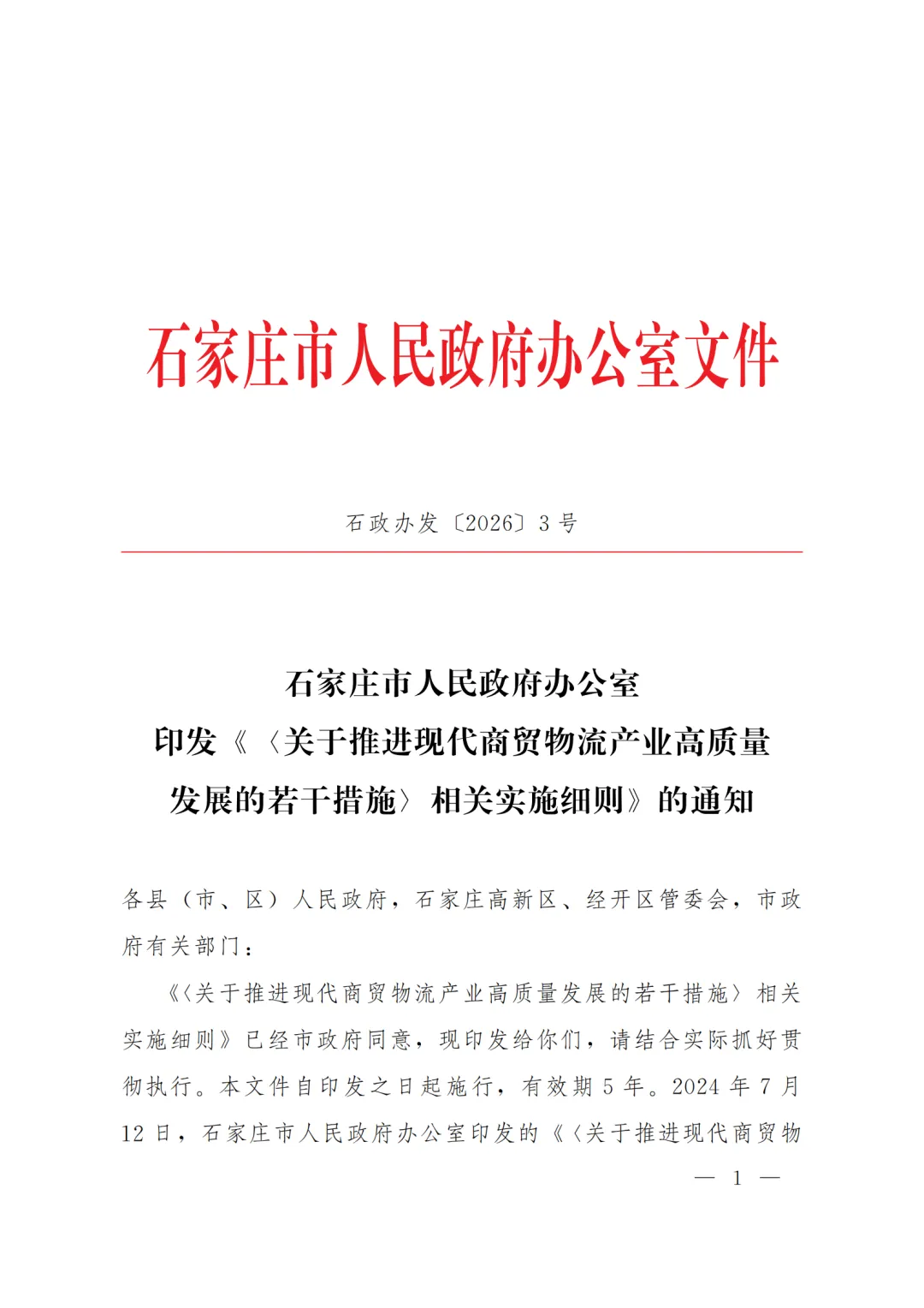 石家庄市人民政府办公室印发