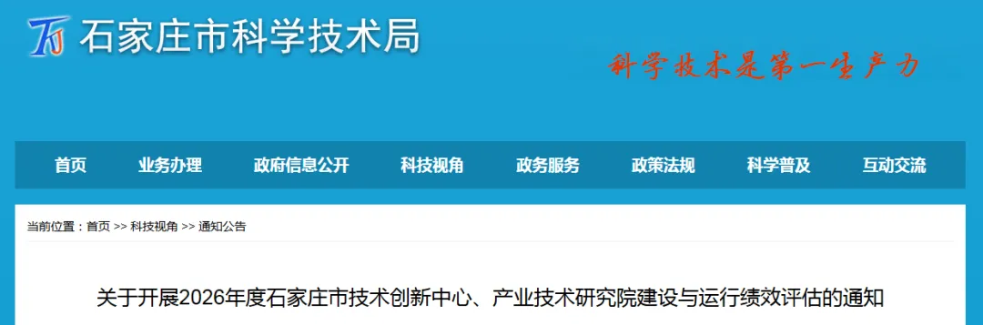 根据《石家庄市技术创新中心建设运行与绩效考核管理办法》(石科规〔2024〕2号)和《石家庄市产业技术研究院建设运行与绩效考核管理办法》(石科规〔2025〕2号)的有关规定,市科技局开展2026年度石家庄市技术创新中心、石家庄市产业技术研究院建设与运行绩效评估工作,现将有关事项通知如下: