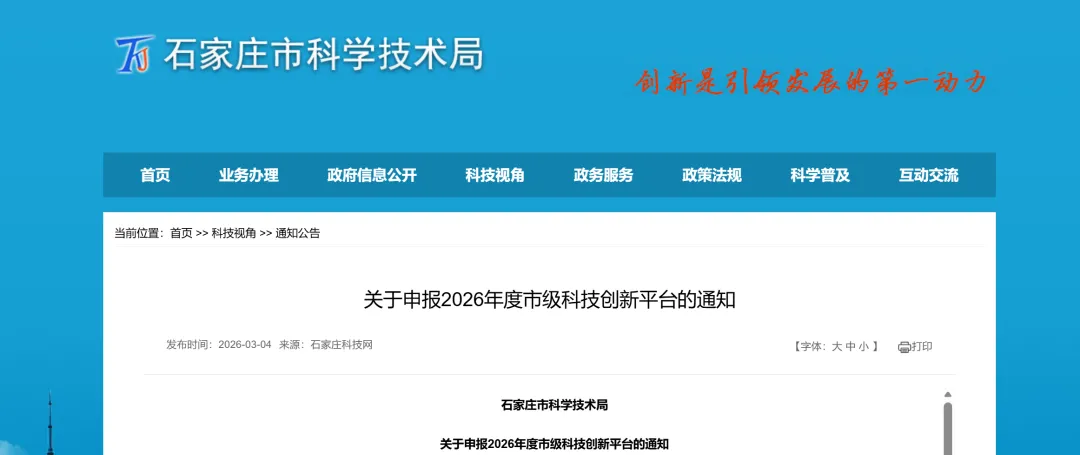 石家庄市科学技术局发布关于申报2026年度市级科技创新平台的通知,申请人填报截止时间:2026年4月7日17时,详情如下: