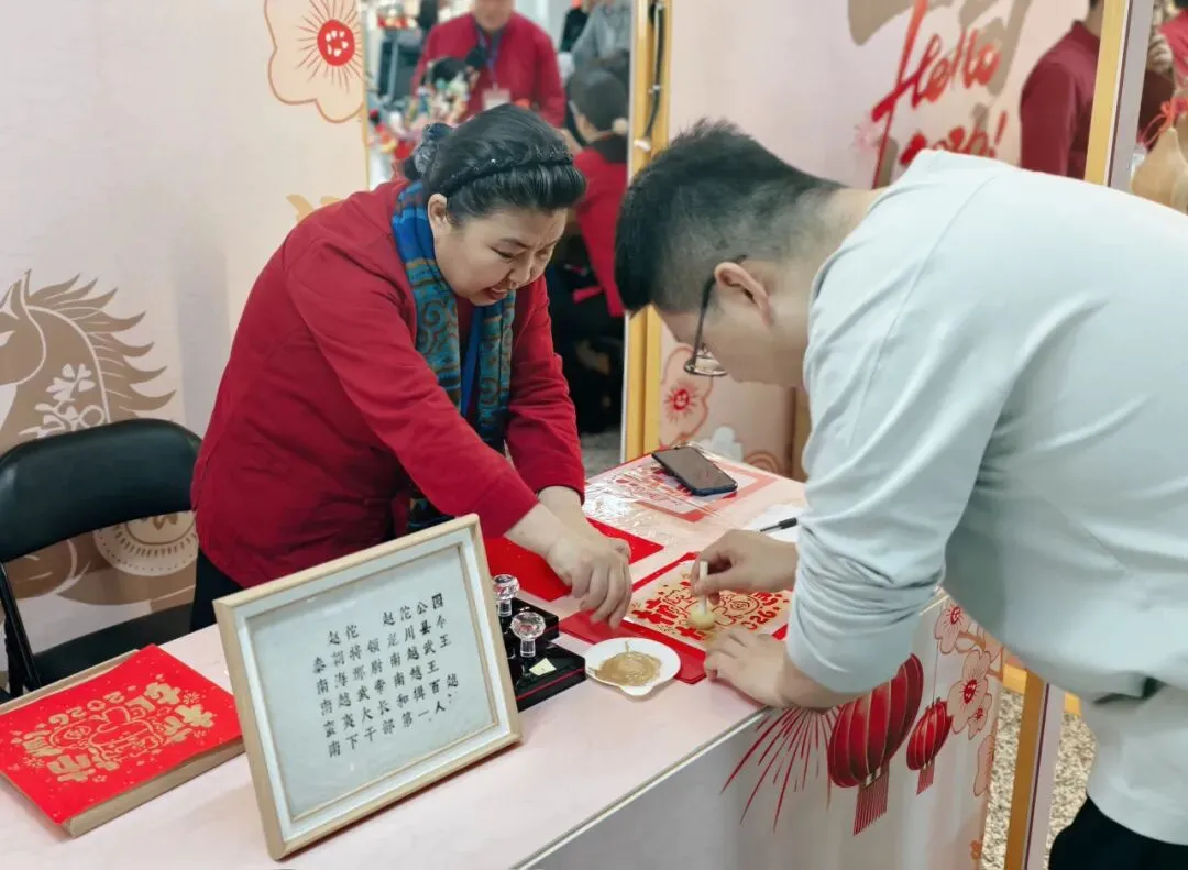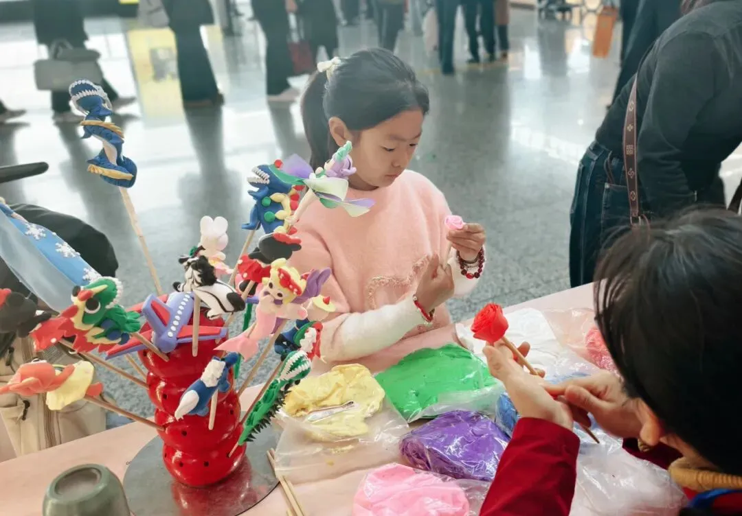 互动体验区更是热闹非凡,旅客在传承人的专业指导下,亲手制作旗袍盘扣、元宵面人、葫芦手作,在一针一线、一捏一揉中体验传统手工的乐趣;还能参与拓印“马上成功”福字、赵佗印章盖章等特色活动,将元宵的美好祝福定格留存。此外,陶笛传承人还带来石家庄本土文物器型陶笛展演,悠扬的音律萦绕航站楼,同时现场指导旅客制作泥哨,让传统音律与手工体验相融合,为旅客带来别样的节日惊喜。