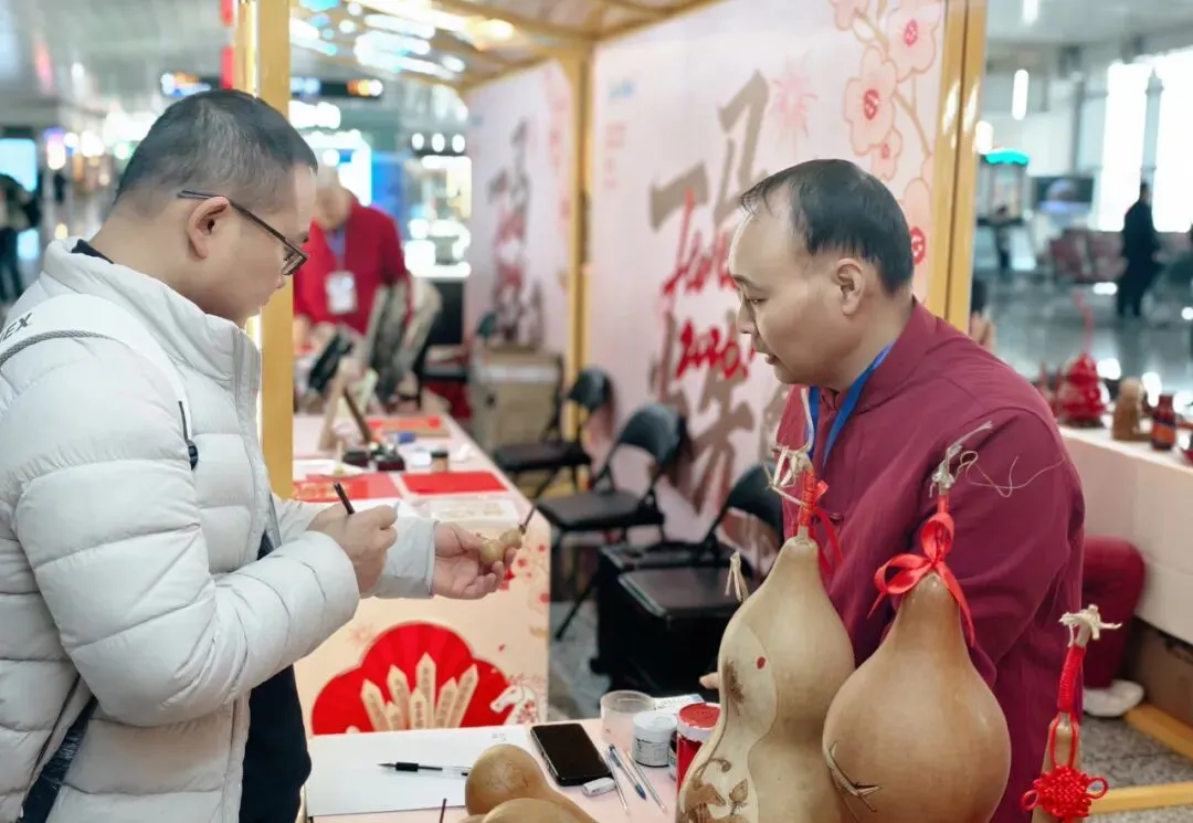 位于2号航站楼10号登机口附近的非遗展演区与互动体验区,吸引了众多旅客驻足围观、积极参与。在非遗展演区,国家级非遗衡水内画、拓片,省级非遗铁板浮雕、漆器,市级非遗旗袍技艺,以及正定县级非遗葫芦烙画等多个特色项目轮番亮相。非遗传承人们现场展示精湛技艺,细致讲解各项工艺的历史渊源、文化内涵与制作流程,部分项目还专门设置互动体验环节,让旅客亲身触摸燕赵非遗的匠心,直观感受传统技艺的独特魅力。