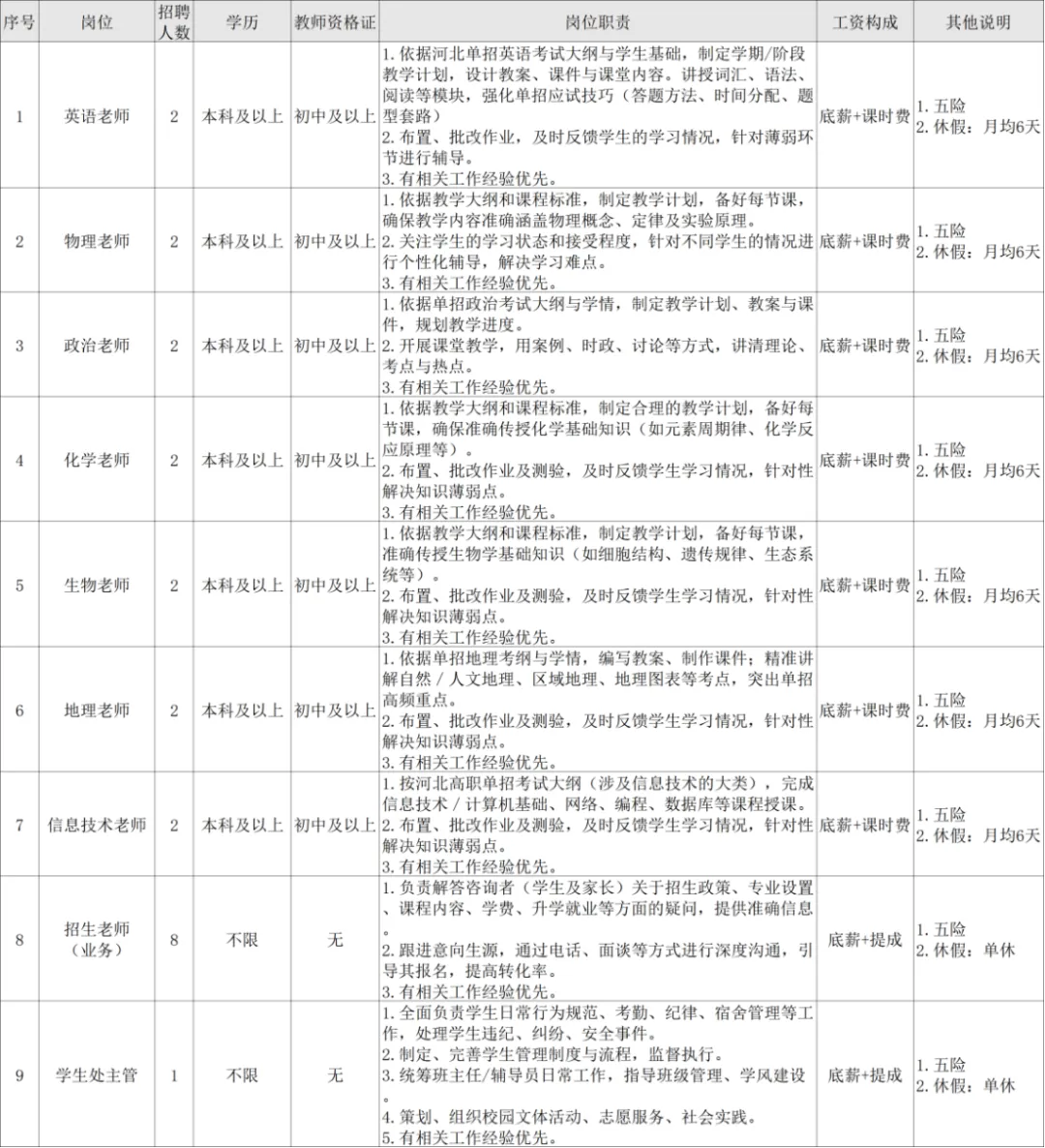 2.报名注意事项每人限报一个岗位。资格审查标准:依据招聘岗位设置的条件进行资格审查。网上资格初审通过的考生可进入网上缴费环节。系统显示缴费成功后即报名通过,具备参加笔试资格(报考招生老师岗位,且符合岗位要求的考生无需缴费及参加笔试,面试时间另行通知,请报考该岗位的考生保持手机畅通)。查询结果为“初审驳回”的考生可根据提示驳回原因进行修改,审核工作人员根据修改后信息进行再次审核。经修改后,初审结果仍显示“未通过”且不能再修改的考生不具备报名资格。网上资格初审通过的考生可进入网上缴费环节,缴纳考试服务费100元(招生老师岗位除外)。系统显示缴费成功后即报名通过,具备参加笔试资格,缴费成功后不予退费,请考生慎重考虑。网上审核时间:2026年2月28日—2026年3月20日下午17:00网上缴费截止时间:2026年3月21日12:00特别说明:1.考生开始报名前,须详细了解本次招聘政策和拟应聘岗位条件,认真阅读《报考须知》,然后按步骤进行具体操作。2.网上报名实行严格的自律机制,考生必须对提交审核的报名信息的真实性负责。在资格审核时,凡发现网上填报的信息与实际情况不一致的,取消应聘资格。3.报名时请规范填写和选择表项,上传的电子照片要符合要求,否则将被报名系统自动拒绝。报考信息通过审核后才能进行缴费操作,缴费成功即完成报名。4.考生应及时关注报名网站的笔、面试等后续公告;务必牢记报名和缴费截止时间、打印《笔试准考证》时间、笔试时间、打印《面试通知单》时间、面试时间等重要时间信息,凡是在规定时间未完成相关操作的,将被视为自动放弃。同时,报名和考试期间务必保管好个人的证件和信息,因个人原因造成丢失、被他人盗用和信息被恶意篡改而影响报名和考试的,责任自负。(三)笔试(招生老师岗位除外)1.笔试内容:笔试采取闭卷方式进行,考试时间90分钟。包含教育学、教育心理学、教学教法、教育法律法规、教师职业道德、时政、专业知识等(不指定复习材料),满分100分,笔试成绩占总成绩的30%。2.笔试具体地点及考试时间和要求详见《笔试准考证》。应聘人员应按照准考证上确定的考试时间、地点、考场参加考试。参加考试时,必须同时携带准考证和有效期内二代身份证(含有效期内的临时身份证),缺少证件的考生不得参加考试。 (四)面试(招生老师岗位除外)面试方式及时间详见后续通知。面试成绩满分为100分,占总成绩的70%,并设合格分数线60分,面试成绩低于60分的不得进入下一招聘环节。 (五)签订合同上岗1.经公示期满无异议的拟录用人员,或有反映问题但经核实不影响录用的,按规定签订劳动合同。2.对公示反映有严重问题并查有实据,不符合录用条件的,取消其拟录人选资格,对反映有严重问题但一时难以查实的,暂缓录用,待查实并做出结论后决定是否录用。3.在办理录用手续期间,不在规定时间报到的,取消其录用资格,并从报考同一岗位中,按总成绩从高分到低分依次递补。4.被录用人员与学校所属单位直接签订《劳动合同》,办理入职、工资、社会保险等相关事宜。(六)福利待遇考核通过后,缴纳社会保险(五险)、提供带薪年假、节日福利、免费住宿、学校食堂、专业培训与晋升机会等。(七)其他有关事项1.凡考生未在规定时间内按要求参加笔试、面试、报到等环节的,均视为自动放弃应聘资格;资格审核贯穿招聘工作全程,在任何环节,发现考生不符合招聘条件,弄虚作假的,取消应聘资格,问题严重的要追究责任。2.请考生网上报名时,务必填写本人常用联系方式,确保在招录期间保持手机等通讯设备畅通。3.考生通过最终面试后与学校有7天的互相考察期。