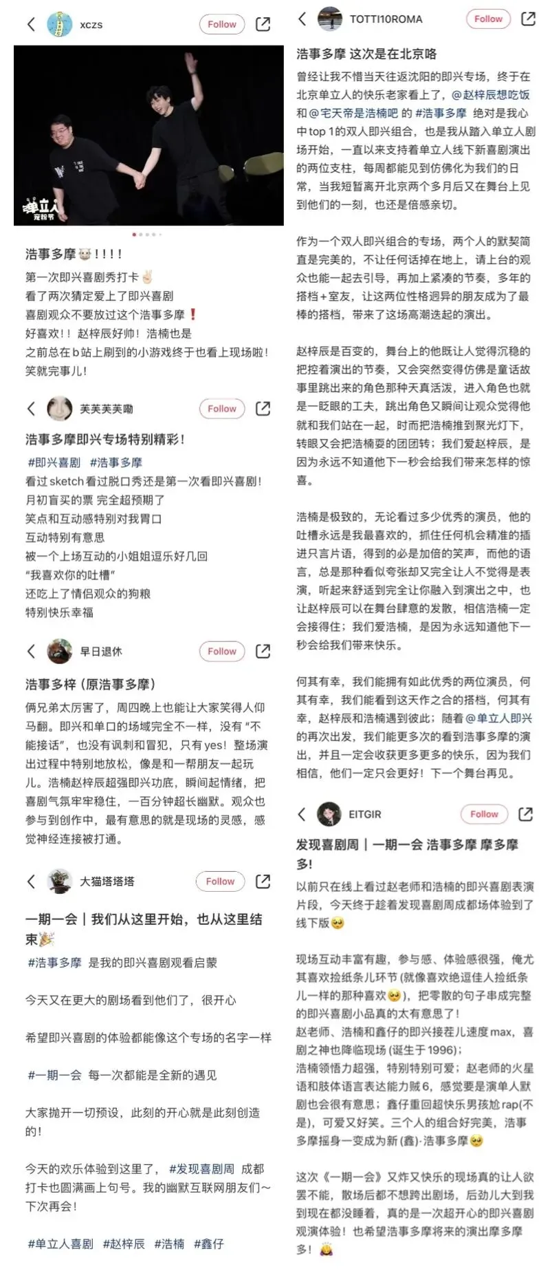 浩事多摩是国内知名的喜剧组合,成员浩楠、赵梓辰能演会编、即兴和新喜剧两手抓,被大家称为“接梗的王”和“即兴的神”。他们舞台经验丰富、默契十足,联手创作和演出的新喜剧专场《一路靠北》、即兴喜剧专场《一期一会》等好评如潮。二人还作为编剧参与过《一年一度喜剧大赛》、《喜人奇妙夜》、《喜剧大会》等知名综艺。他们还曾受邀在 First青年电影展、北京戏剧嘉年华等进行表演、开设即兴工作坊,深受观众和学员的喜欢。*观众Repo 图源网络,有问题请联系我们。