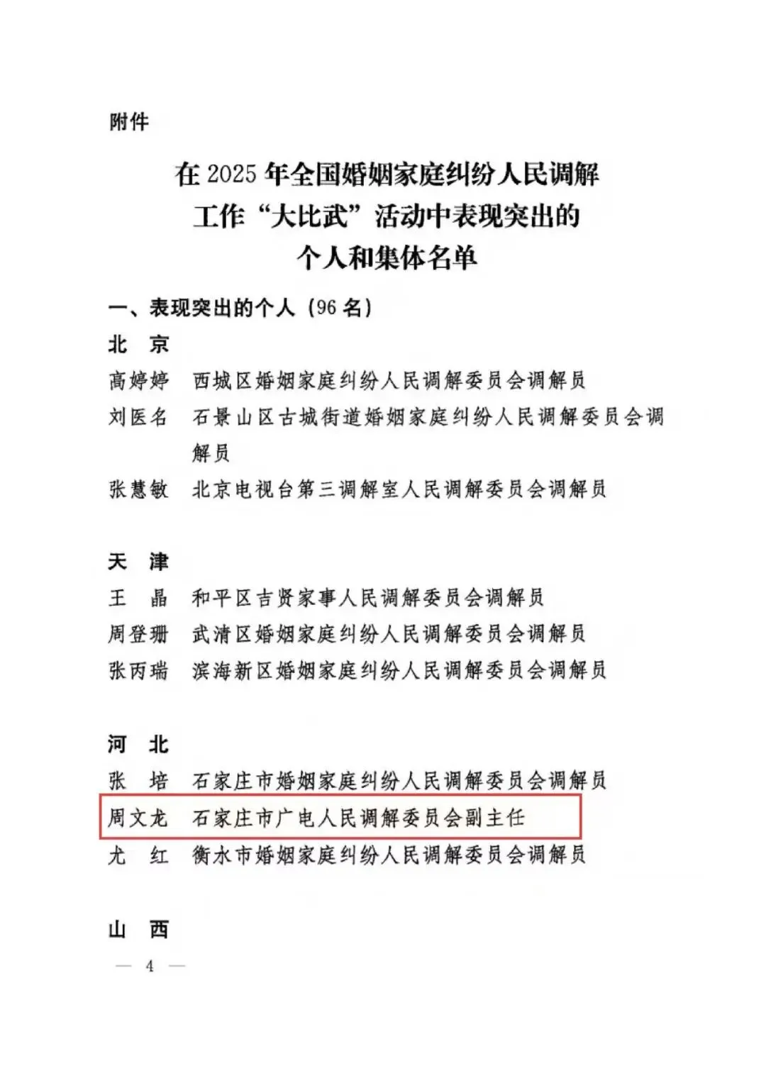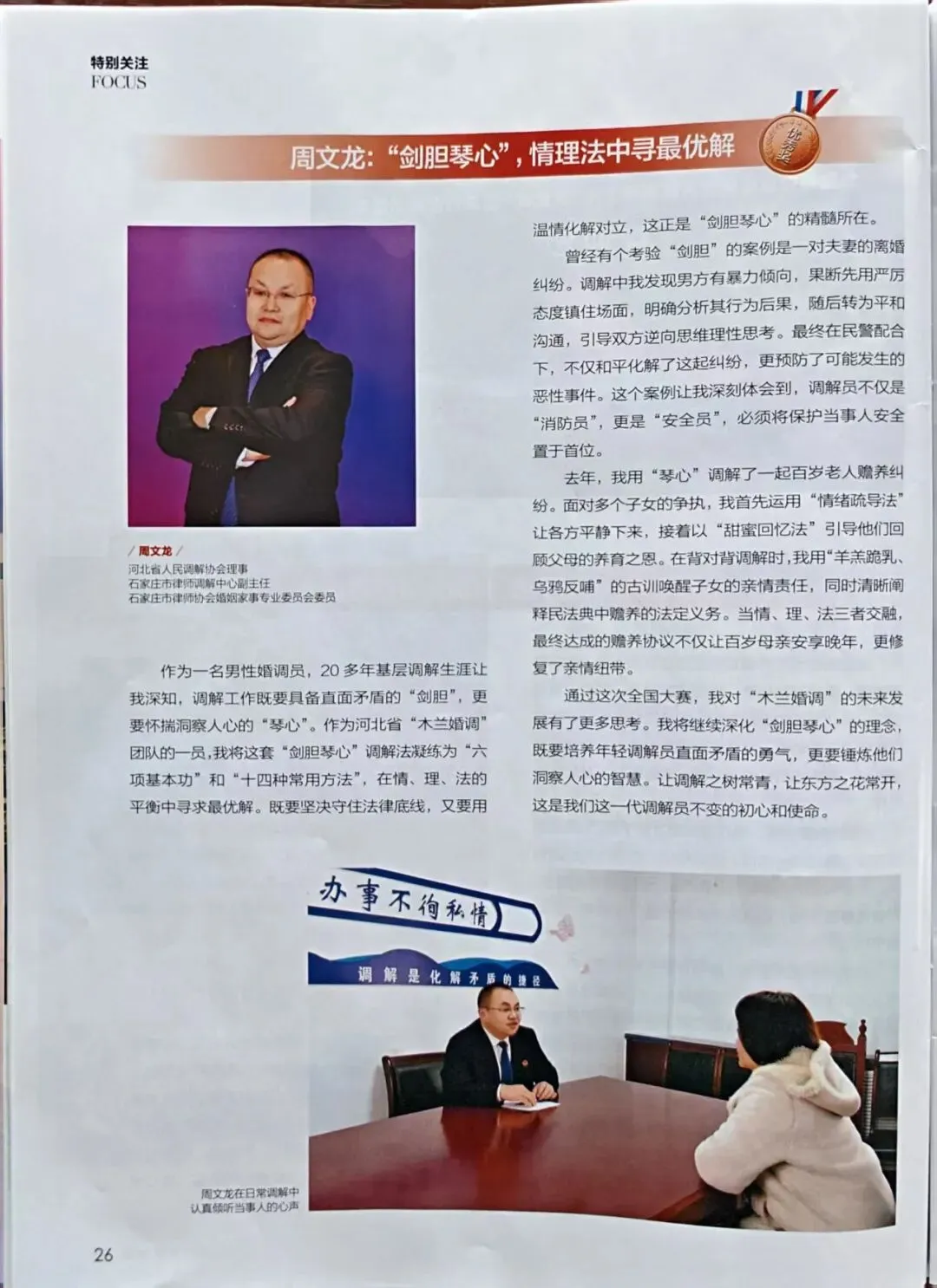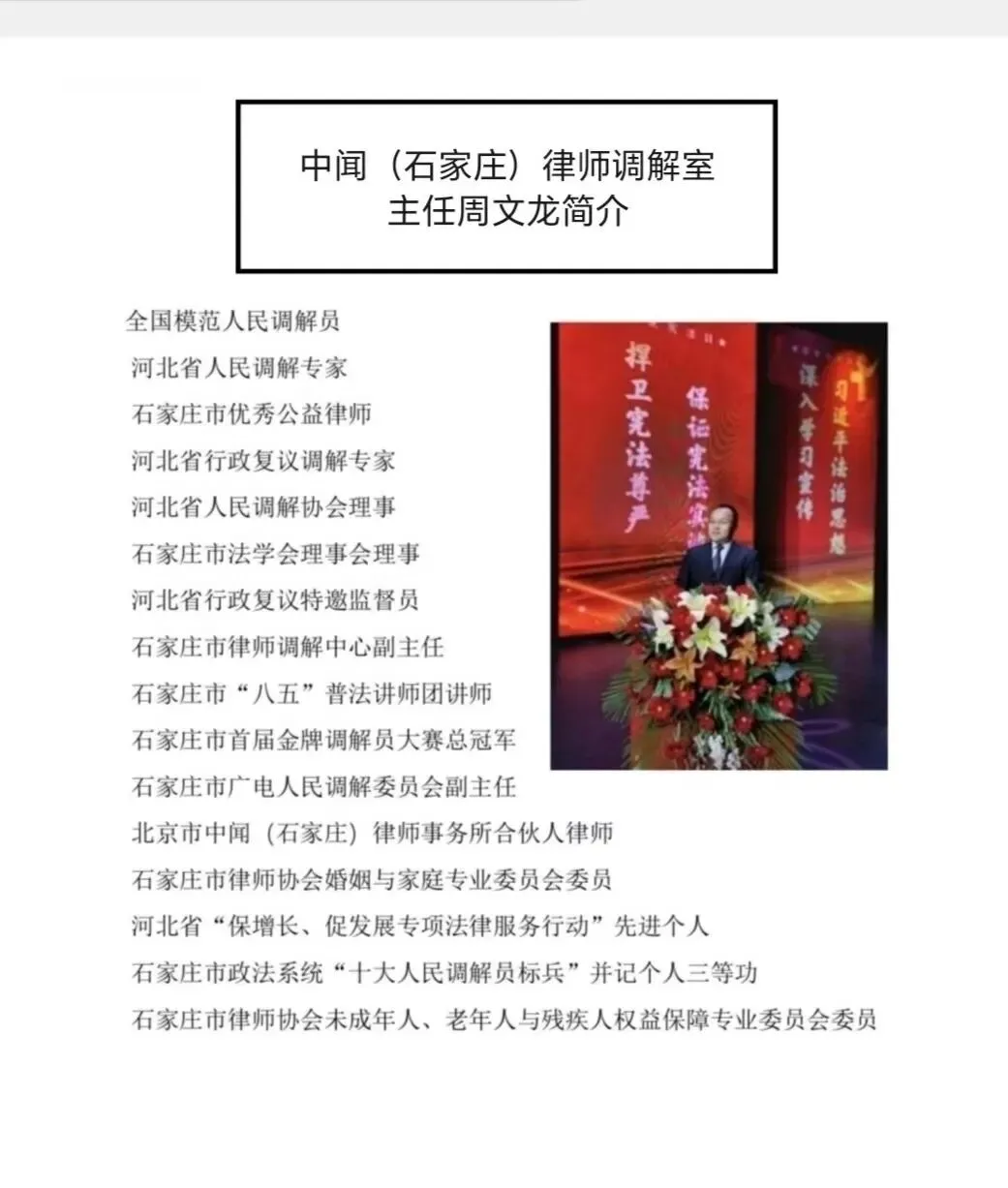 近日,司法部、全国妇联联合发布通报,对2025年全国婚姻家庭纠纷人民调解工作“大比武”先进个人与集体予以表彰。中闻律师事务所石家庄办公室管委会委员、婚姻家事团队负责人、中闻(石家庄)律师调解室主任周文龙律师获评先进个人,并正式入选全国婚姻家庭纠纷人民调解人才库。