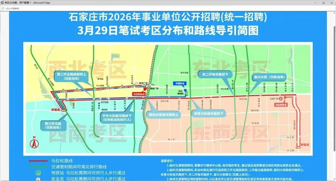 石家庄市2026年事业单位公开招聘笔试于3月28日、3月29日举行,其中3月29日笔试与石家庄马拉松赛同期,石家庄市城区部分路段将实行临时交通管制。为确保考生朋友顺利参加考试,请务必认真阅读以下提示: