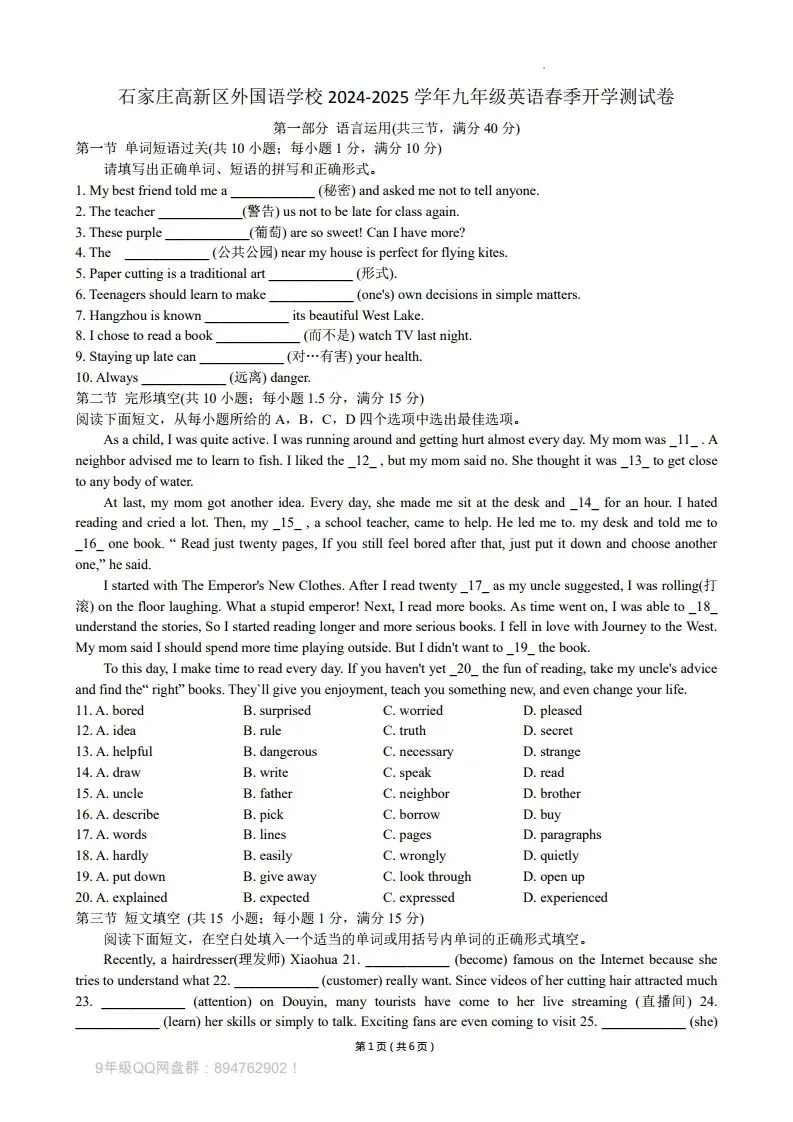 (一)夸克网盘分享了「【0304】2025年石家庄高新区外国语学校年级英语开学测试卷」,链接:https://pan.quark.cn/s/e1f30fc98af8