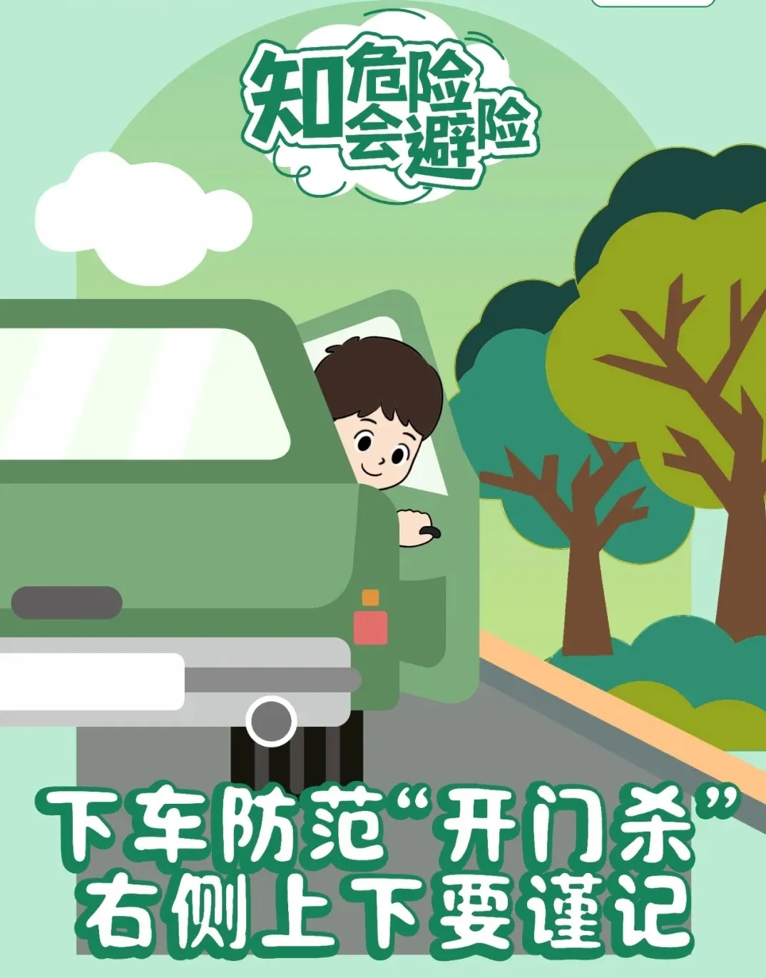 4.巧避“开门事故”:家长应提前教授孩子从右侧安全开门下车,开车门时用距车门较远的那只手开减少视觉盲区,下车前仔细观察车外后方情况,开启一条门缝,确认安全后再小心开门。