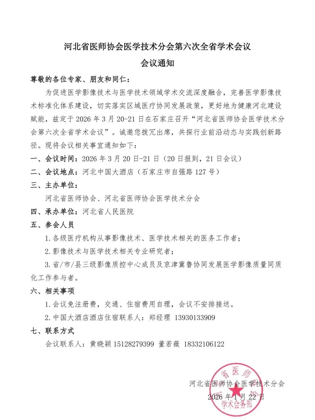 3/20-21日 石家庄 | 关于举办“河北省医师协会医学技术分会第六次全省学术会议”的通知