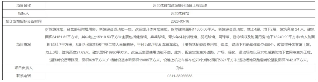 近日,石家庄公共资源交易网发布河北体育馆改造提升项目工程监理招标计划公告。